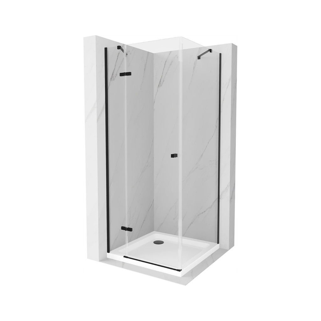 Mexen Roma, sprchový kout s 1-křídlými dveřmi 80 (dveře) x 80 (stěna) cm, 6mm čiré sklo, černý profil, slim sprchová vanička 5cm bílá s černým sifonem, 854-080-080-70-00-4010B