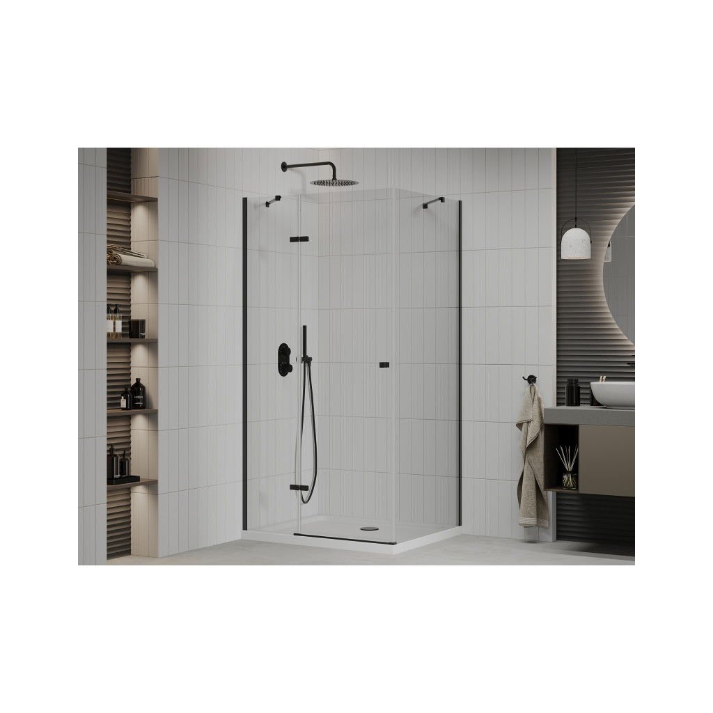 Mexen Roma, sprchový kout s 1-křídlými dveřmi 90 (dveře) x 120 (stěna) cm, 6mm čiré sklo, černý profil, slim sprchová vanička 5cm bílá s černým sifonem, 854-090-120-70-00-4010B