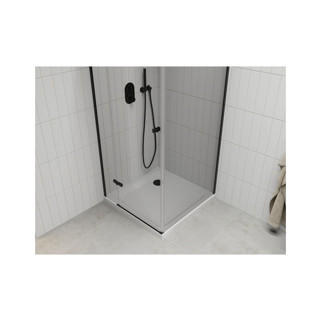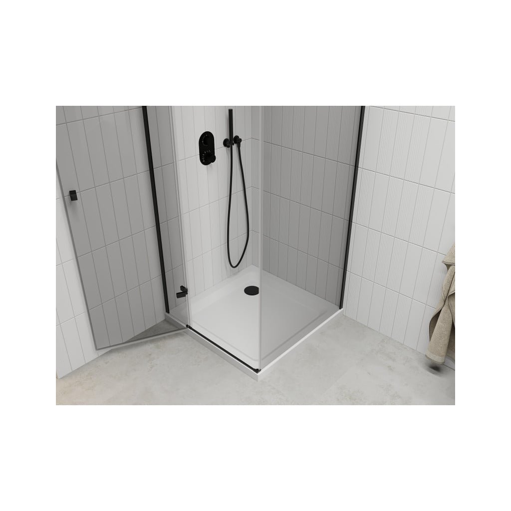 Mexen Roma, sprchový kout s 1-křídlými dveřmi 90 (dveře) x 90 (stěna) cm, 6mm čiré sklo, černý profil, slim sprchová vanička 5cm bílá s černým sifonem, 854-090-090-70-00-4010B