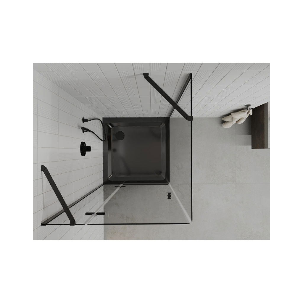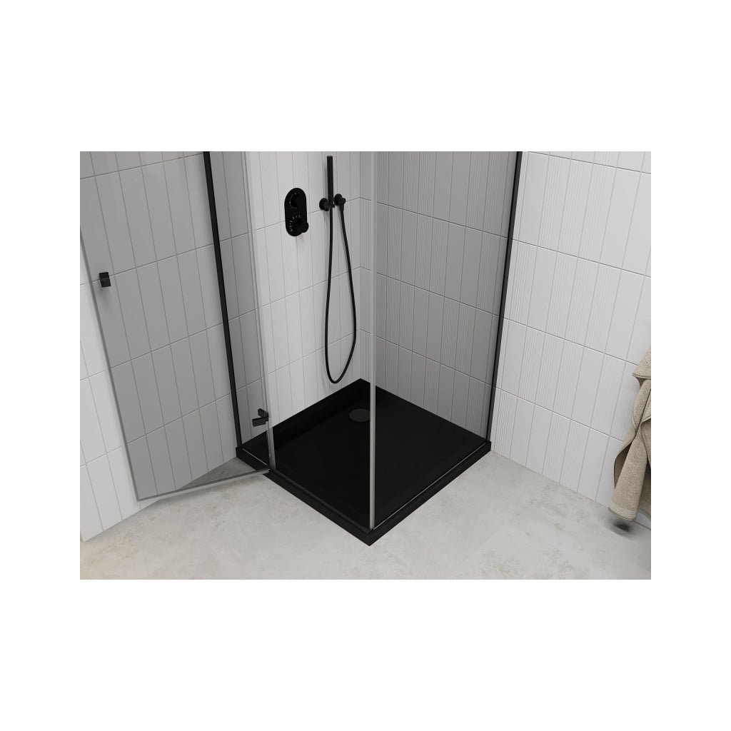 Mexen Roma, sprchový kout s 1-křídlými dveřmi 90 (dveře) x 90 (stěna) cm, 6mm čiré sklo, černý profil, slim sprchová vanička 5cm černá s černým sifonem, 854-090-090-70-00-4070B