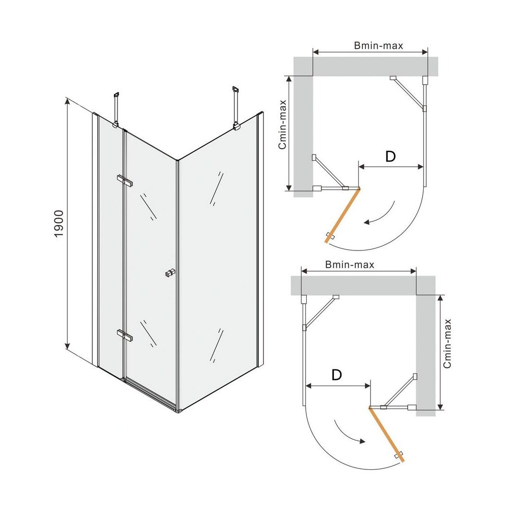 - Část se sprchovými dveřmi (B min-max): rozměry v tabulce dole