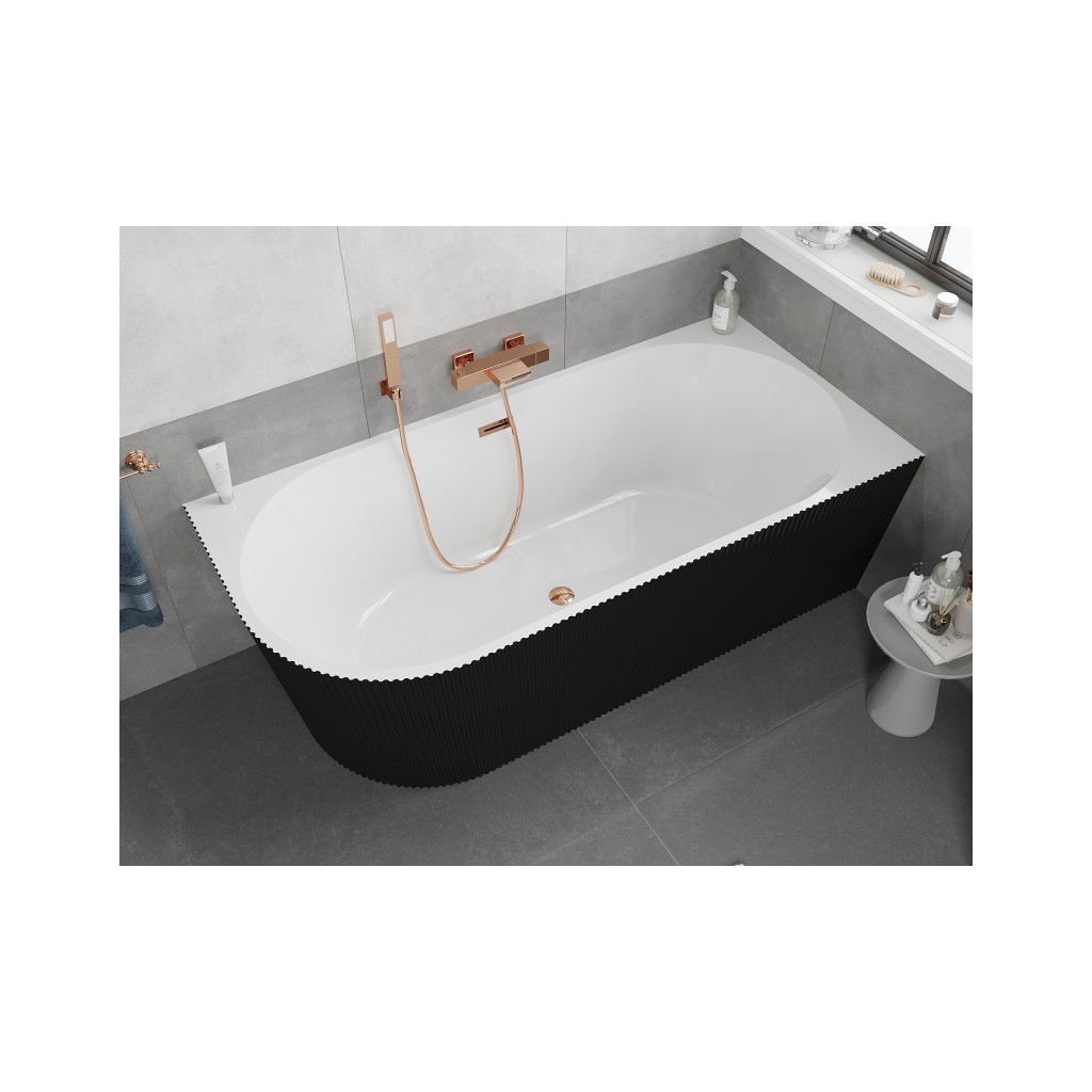 Mexen Silo, rohová volně stojící rýhovaná vana, pravá, 150 x 75 cm, bílá-černá, růžové zlato přepad, 52891507575P-60