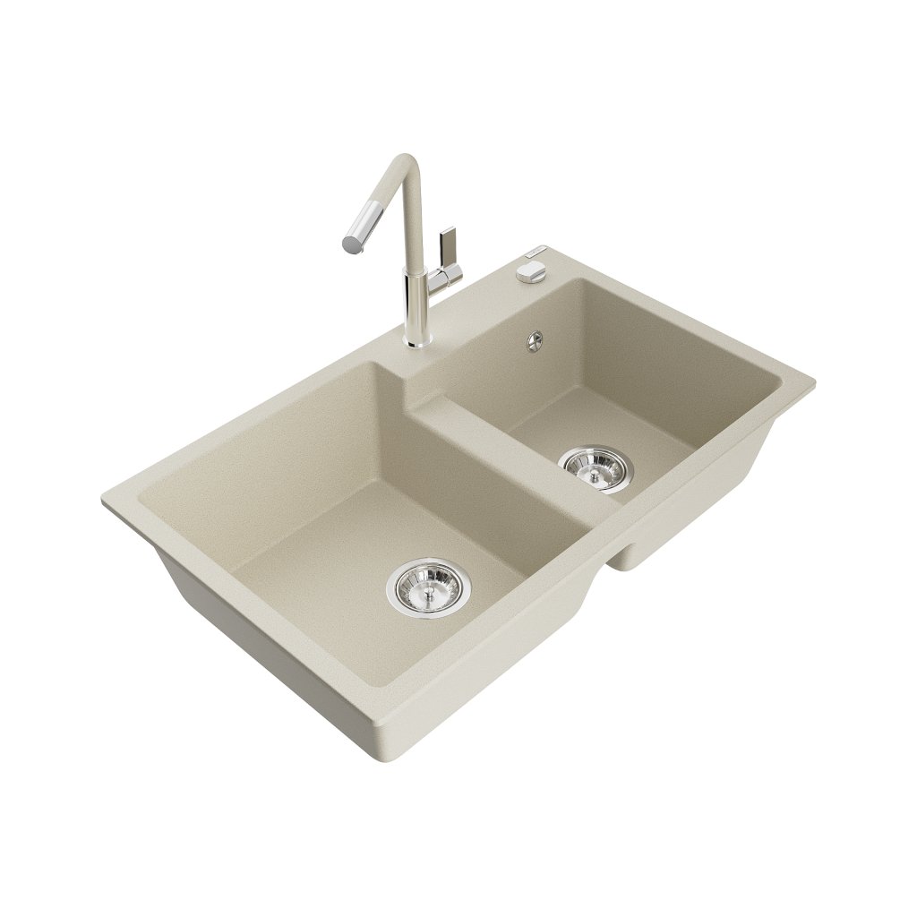 Mexen Tomas, 2-komorový granitový dřez 800x500x190 mm a dřezová baterie Flora, béžová, 6516-69-670401-09