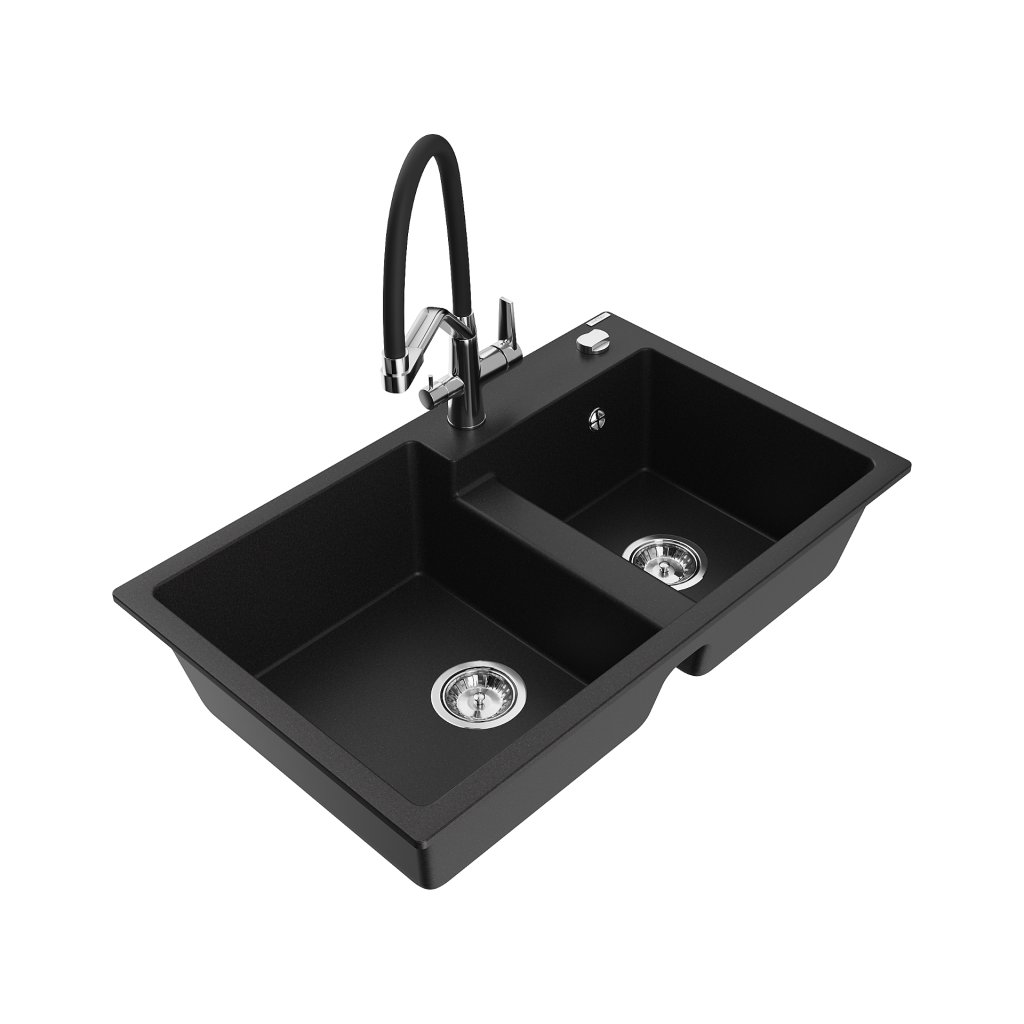 Mexen Tomas, 2-komorový granitový dřez 800x500x190 mm a kuchyňská baterie Duo, černá, 6516-77-671701-07