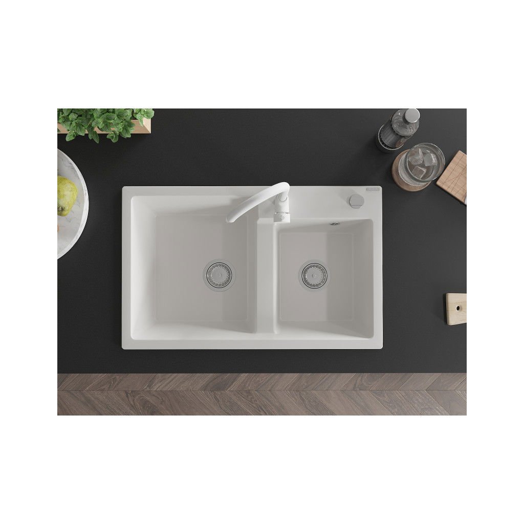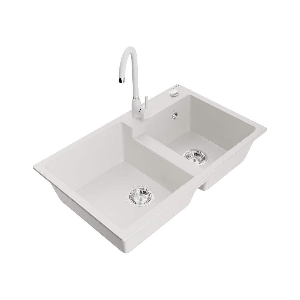 Mexen Tomas, granitový dřez 800x500x190 mm, 2-komorový a bílá baterie Telma, bílá, 6516-20-670200-20