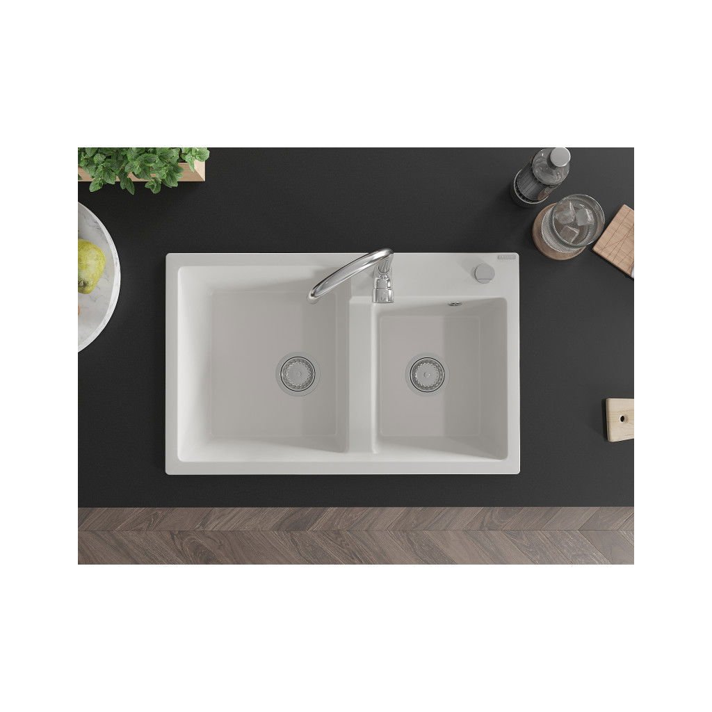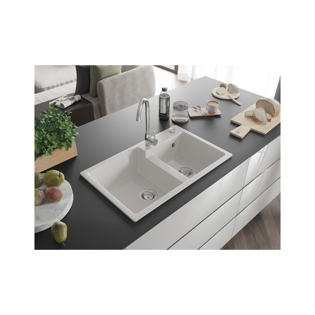Mexen Tomas, granitový dřez 800x500x190 mm, 2-komorový a chromová baterie Telma, bílá, 6516-20-670200-00