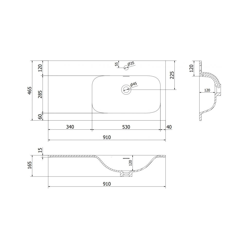Technické údaje: Rozměry: 91x46,5x16,5 cm Hloubka: 12 cm Typ: Zapuštění do desky, pravý Barva: Bílý lesk Materiál: Konglomerát Přepadový otvor: Ano Otvor na baterii: AnoDoplňkové parametry