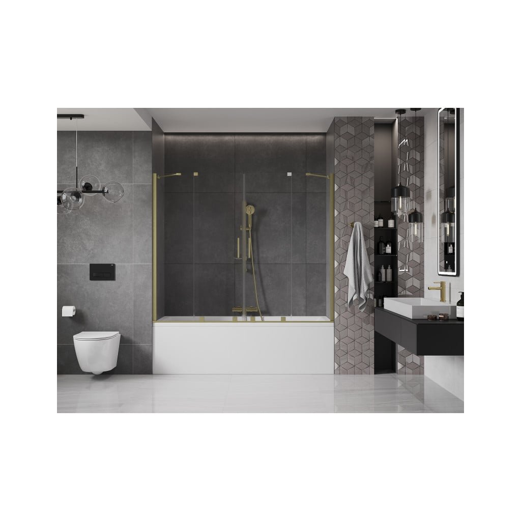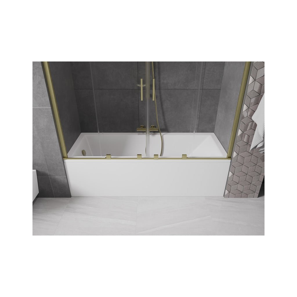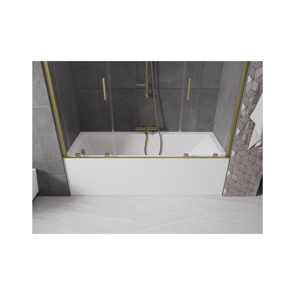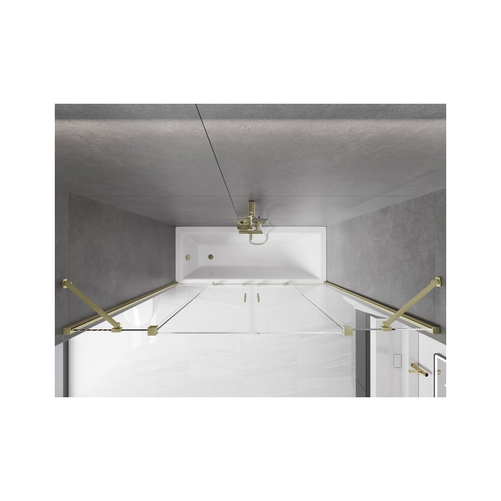 Mexen Velar Duo, vanová zástěna 2-křídlová s posuvnými dveřmi 190 x 150 cm, 8mm čiré sklo, zlatý matný profil, 896-190-000-02-55