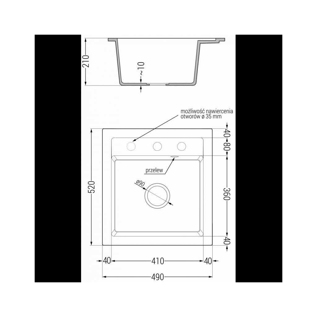 - Odtokový otvor: 3,5 ”; fi = 90 mm