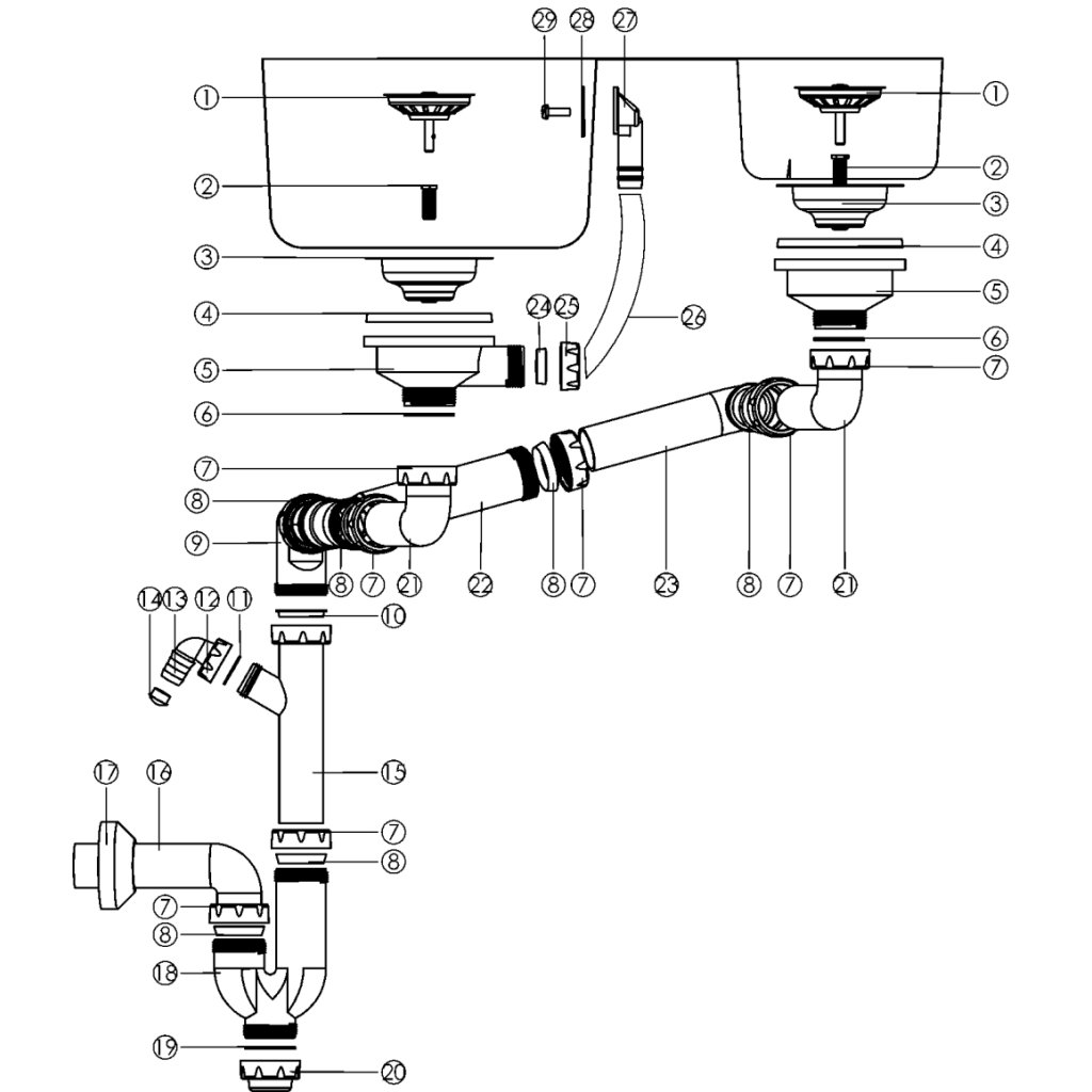 Sifon na dvojitý dřez, odpad dřezu 89mm přepad ze dřezu Vhodný pro dřezy DR50/92, DR48/64AA, DR48/98, DR50/100, DR49/62Doplňkové parametry