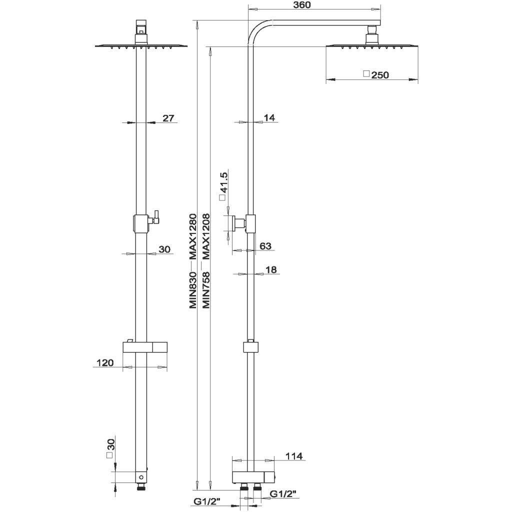 Prvotřídní provedení černá-mat. Set je vhodný pro připojení k vanové nebo sprchové baterii se spodním vývodem. Součástí balení je hlavová sprcha s průměrem 250 x 250 mm, kovová hadice 150 cm a 1-polohová ruční sprcha. Výška setu je 830 - 1275 mm. Součástí balení je připojovací hadička v délce 70 cm.Doplňkové parametry