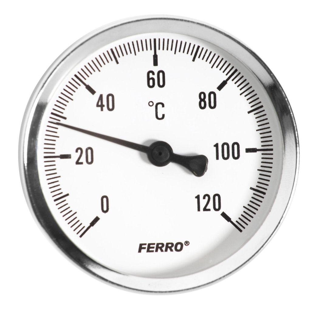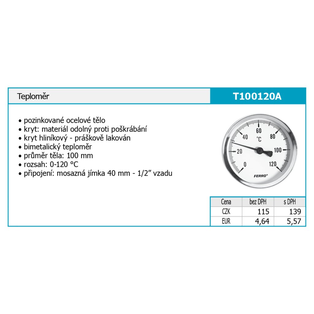 Teploměr axiální • pozinkované ocelové tělo • kryt: odolný materiál poškrábání • kryt hliníkový - práškově lakovaný • bimetalický teploměr • průměr těla: 100 mm • rozsah: 0-120°C • připojení: mosazná jímka 40 mm - 1/2” vzaduDoplňkové parametry