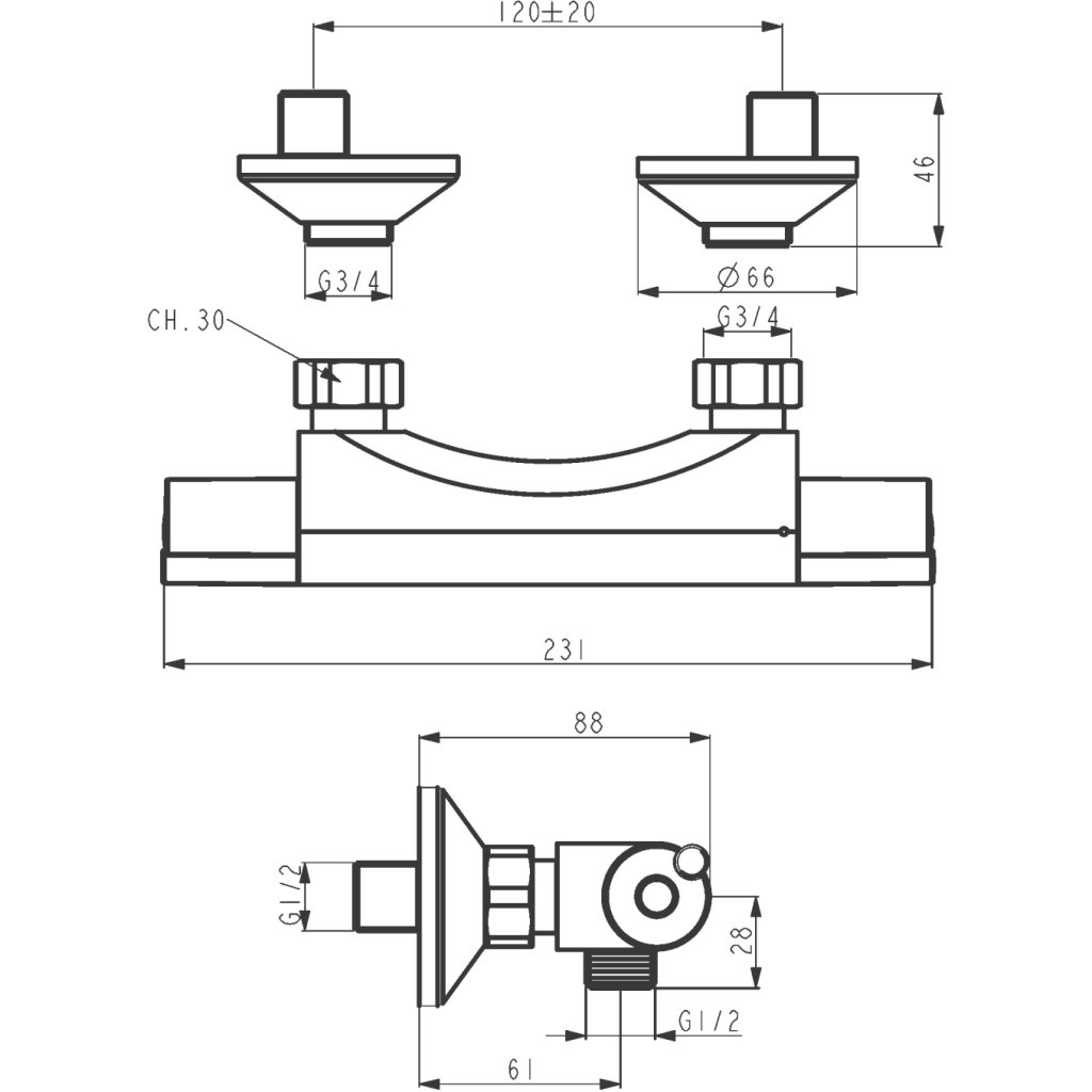 Odolná, termostatická kartuš se 2 letou zárukou . Prvotřídní chromové provedení. Sprchová termostatická nástěnná baterie s rozestupem 120 mm a spodním vývodem na hadici.