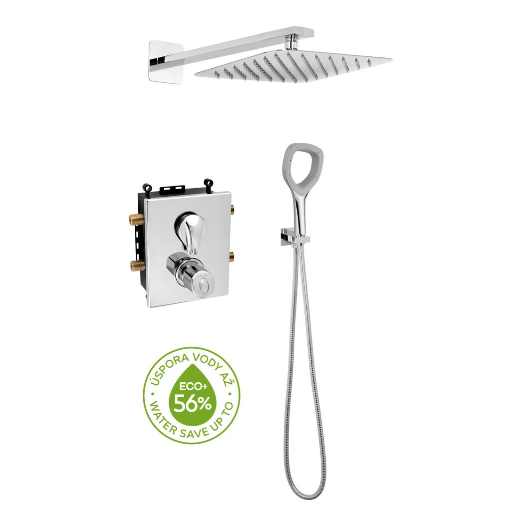 Termostatická sprchová podomítková sada s příslušenstvím. Box je dodáván spolu s krytem páky a přepínače. Sada obsahuje podomítkovou sprchovou baterii s termostatickou kartuší KEROX se 7 letou zárukou , hadici 150 cm, hlavovou sprchu v rozměru 250x250 mm, úspornou ruční sprchu a hranatý stěnový vývod vody s držákem na ruční sprchu.