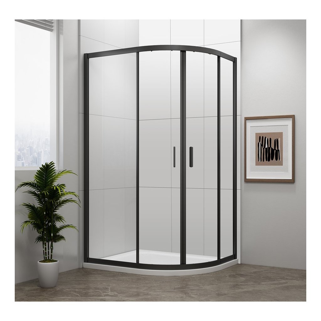 - Čtvrtkruhové zástěny s dvoudílnými posuvnými obloukovými dveřmi, rohový vstup