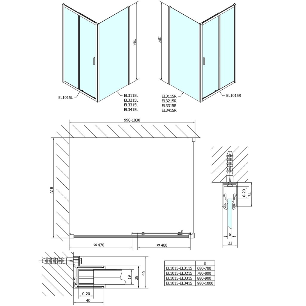 - Instalační rozměr dveří do niky lze díky rozšiřovacímu profilu EL825 zvětšit o 25 mm na každou stranu, celkem o 50 mm