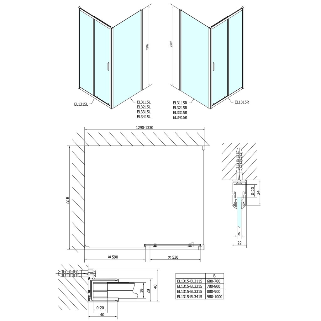 - Instalační rozměr dveří do niky lze díky rozšiřovacímu profilu EL825 zvětšit o 25 mm na každou stranu, celkem o 50 mm
