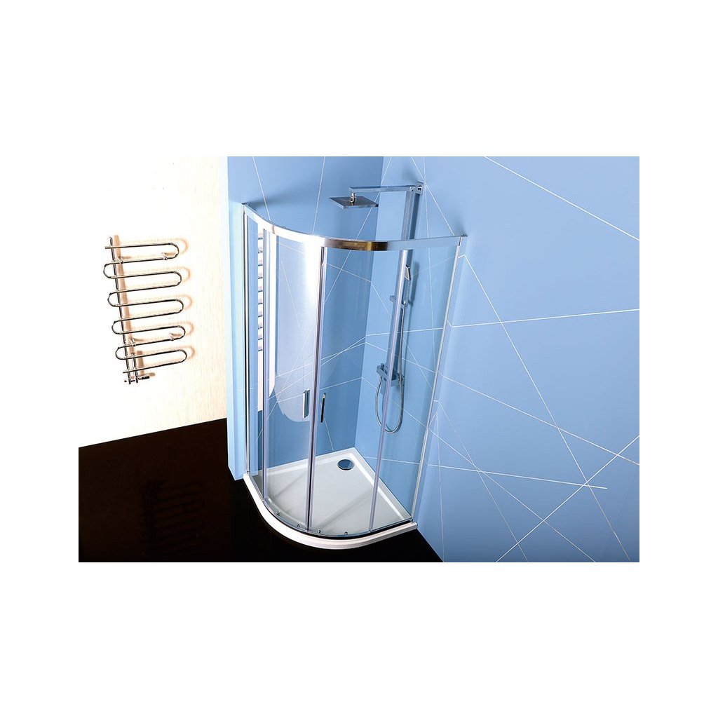 - Čtvrtkruhové zástěny s dvoudílnými posuvnými obloukovými dveřmi, rohový vstup