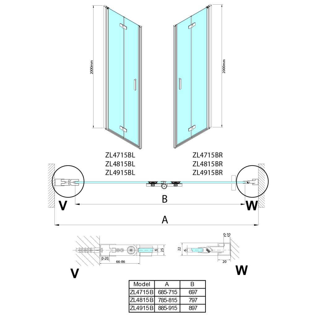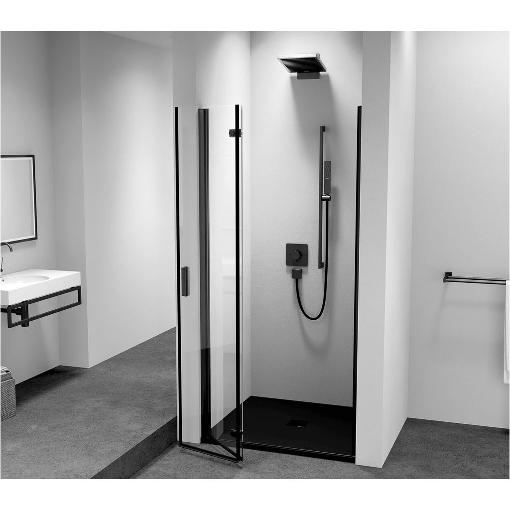 - Skládací dveře 700 až 900 mm v provedení levá a pravá lze instalovat do niky nebo v kombinaci L/R vytvořit čtvercovou nebo obdélníkovou zástěnu s rohovým vstupem