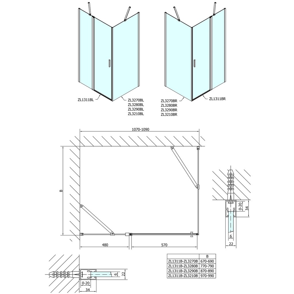 - Skládací dveře 700 až 900 mm v provedení levá a pravá lze instalovat do niky nebo v kombinaci L/R vytvořit čtvercovou nebo obdélníkovou zástěnu s rohovým vstupem