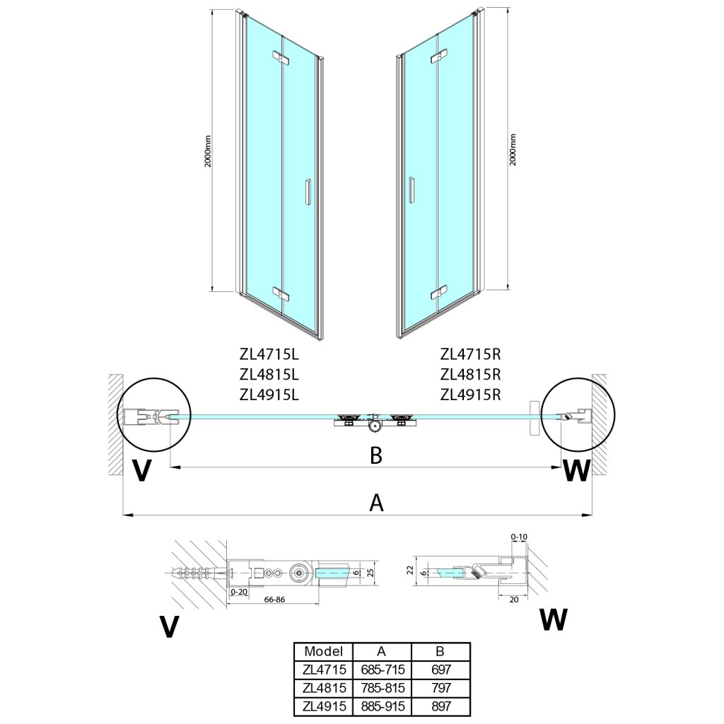 - Skládací dveře 700 až 900 mm v provedení levá a pravá lze instalovat do niky nebo v kombinaci L/R vytvořit čtvercovou nebo obdélníkovou zástěnu s rohovým vstupem