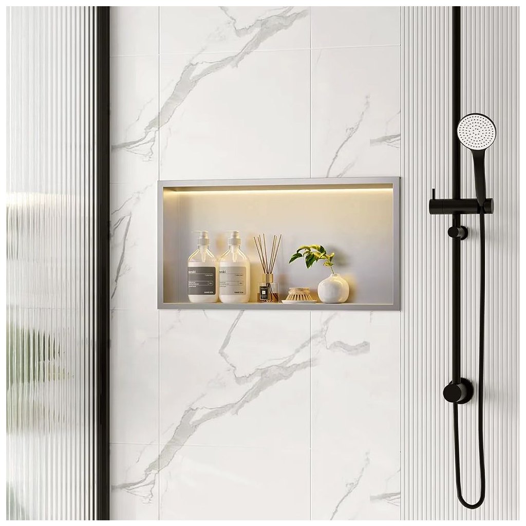 Přináší do koupelny teplé, příjemné světlo, které zdůrazňuje atmosféru interiéru a zvyšuje komfort každodenních činností. Díky třídě ochrany IP66 je police plně chráněna proti vodě a vlhkosti, což z ní činí bezpečnou volbu i do sprchového koutu. Instalace do výklenku umožňuje minimalistický efekt a zároveň vytváří praktické místo pro kosmetiku a koupací doplňky.