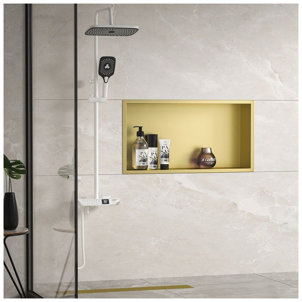 Elegantní broušené zlato dodává poličce moderní a luxusní vzhled. Praktická police pro udržení pořádku a pořádku bude fungovat jako doplňkový dekorativní prvek v každé koupelně.