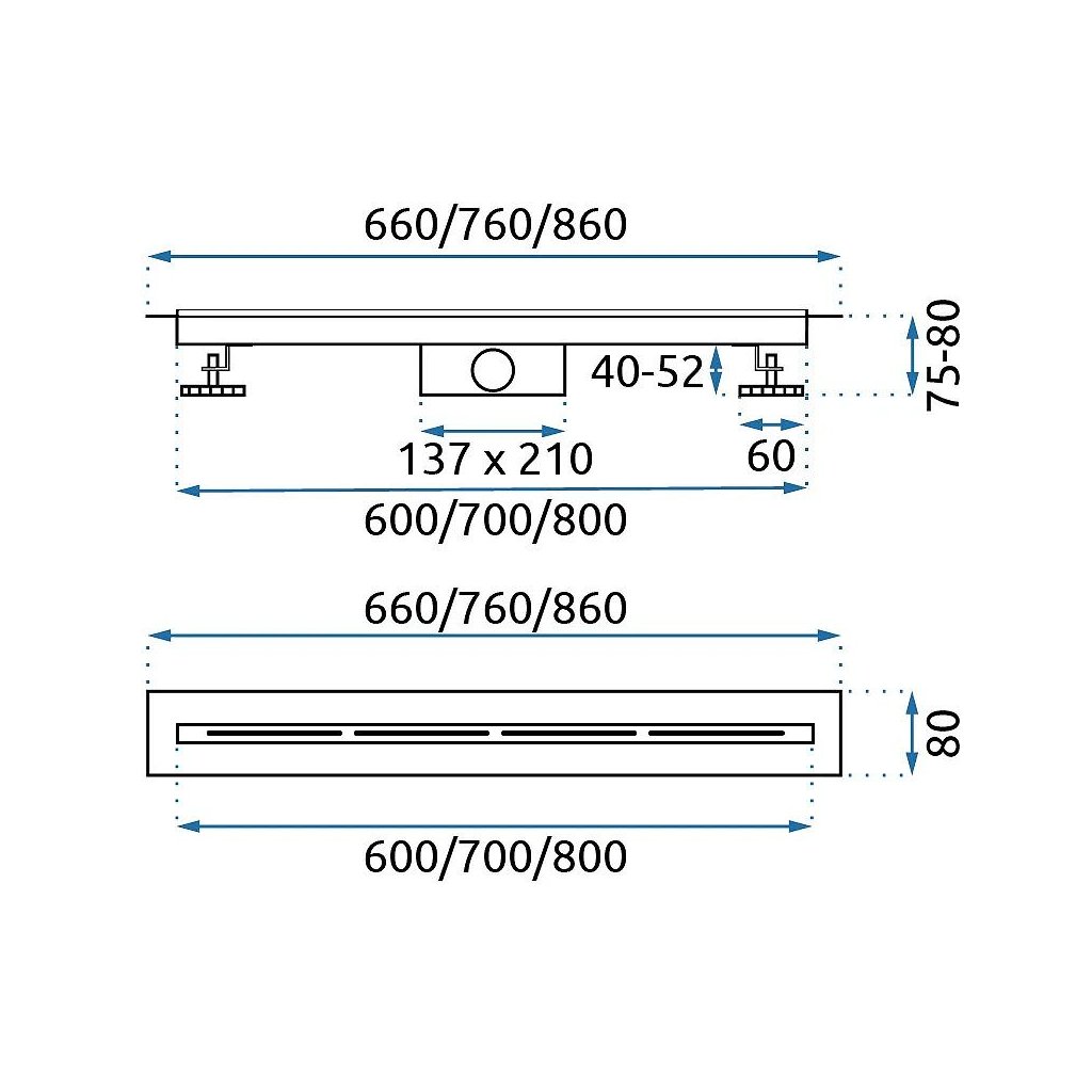 Odtokový žlab je celý vyroben z kyselinovzdorné nerezové oceli Aisi 304. Je vybaven řadou inovativních technologií, které usnadňují montáž a každodenní používání. V odtoku je použit dvojitý filtrační systém, který dokonale zabraňuje vnikání nečistot a předmětů, které mohou blokovat odtok vody do kanalizace. Výhodou tohoto systému je snadné čištění. Sada obsahuje: nohy, sifon, Dry-Fix manžetu, košík, uživatelskou příručku a háček pro výměnu krytu žlabu.Doplňkové parametry