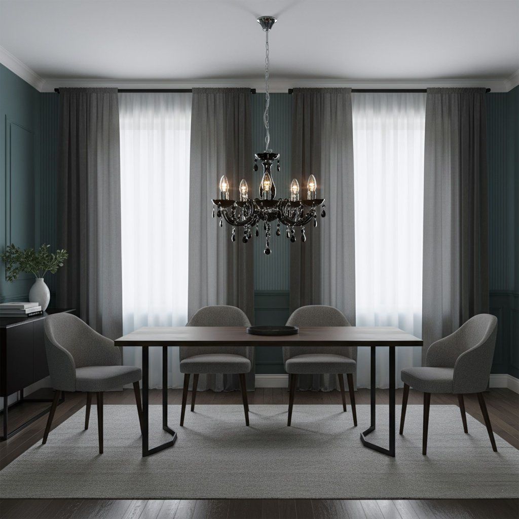 Klasický lustr EBT002-5CP černý/chrom Černý pětiramenný lustr s chromovými akcenty je výrazným a elegantním prvkem do jídelny i obývacího pokoje. Poloprůsvitné černé přívěsky pěkně odrážejí světlo, výšku jednoduše nastavíte podle stolu. ✔️ pět ramen – rovnoměrné, náladové světlo ✔️ černá & chrom – výrazný, nadčasový charakter ✔️ dekorativní přívěsky a řetězy – hloubka a lesk ✔️ nastavení výšky do ~123 cm ✔️ kompaktní Ø ~44 cm – nepřetěžuje prostor Model EBT002-5CP spojuje kovový rám. Jemně zaoblená ramena s miskami a kaskády černých kapek dodávají eleganci. Chromová rozeta a řetěz usnadňují montáž i regulaci. Přirozeně zapadne do stylů modern classic, glamour a art déco. Vhodný jako centrální bod nad jídelním stolem, v obýváku, hale či ložnici. Jediným prvkem přidá interiéru třídu a příjemnou večerní atmosféru.Doplňkové parametry