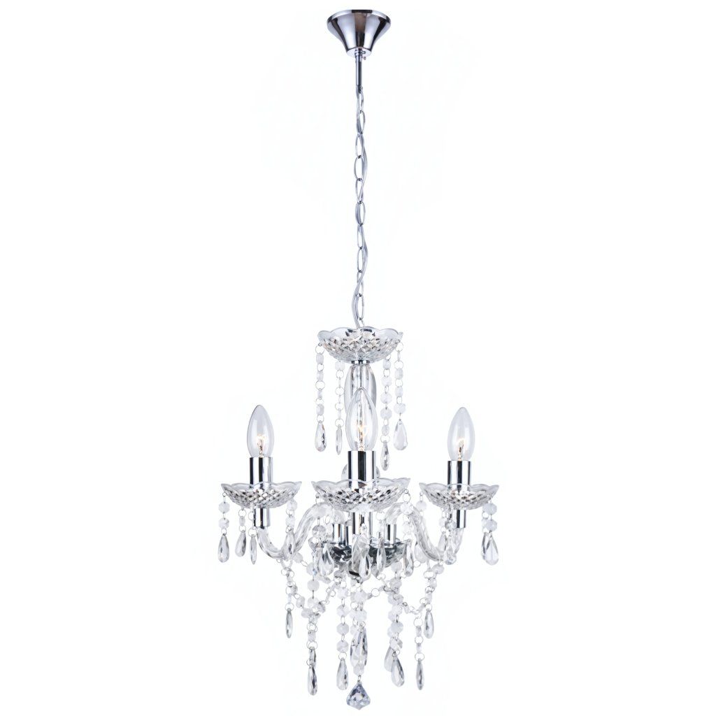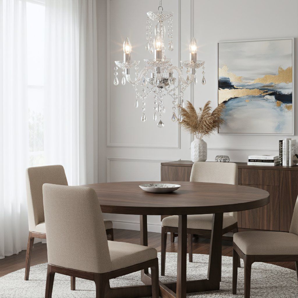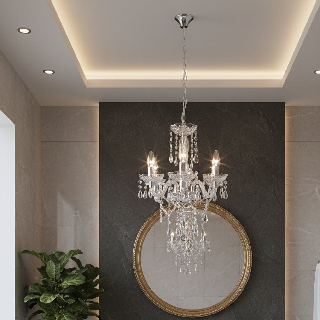 Klasický lustr EBT006-3CP Pětiramenný chromový lustr s čirými přívěsky vnese do interiéru reprezentativní atmosféru. Vyvážený tvar svítí rovnoměrně, výšku lze nastavit až do 123 cm. ✔️ pět ramen – harmonické osvětlení ✔️ čiré přívěsky s krystalovým efektem ✔️ nadčasový chrom ✔️ nastavitelná výška do 123 cm ✔️ průměr 44 cm – výrazný, ale lehký Kovová kostra a fasetované transparentní prvky krásně lámou světlo. Oblá ramena, misky a kaskády kapek dodávají hloubku. Poměr (Ø44 cm, max. výška 123 cm, kabel 70 cm) působí vzdušně. ip20 – do interiéru. Hodí se nad jídelní stůl, do obývacího pokoje, předsíně i ložnice; funguje ve stylech modern classic, glamour a art déco. Zvolte EBT004-5CP a povyšte prostor jedním výrazným prvkem.Doplňkové parametry