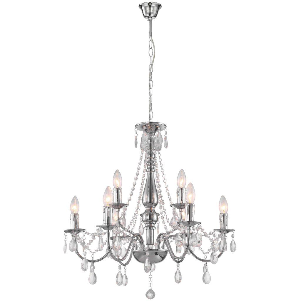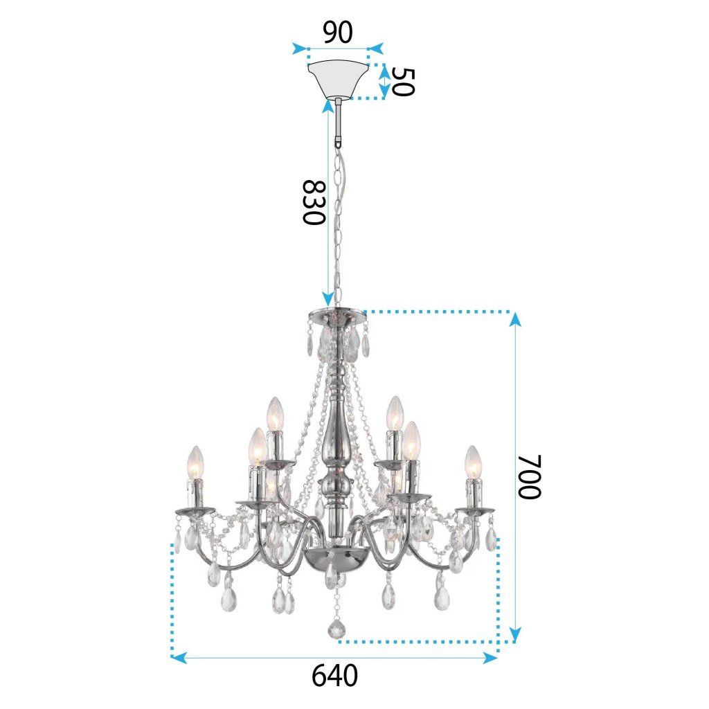 Stylový závěsný lustr s devíti světelnými body je dokonalým spojením klasiky a moderní elegance. Kovová konstrukce s chromovým leskem vytváří pevnou základnu pro dekorativní plastové závěsy, které jemně odrážejí světlo a dodávají interiéru výjimečný lesk. Lampa se skvěle hodí do obývacího pokoje, jídelny, chodby nebo ložnice, kde se stane nejen zdrojem světla, ale také ozdobou prostoru. Díky klasickému uspořádání ramen a dekorativním řetězům a závěsům tento model dokonale zapadne do stylu glamour, klasického nebo moderního s nádechem elegance. Devět světelných zdrojů E14 zajišťuje rovnoměrné osvětlení místnosti. Není to jen svítidlo, ale také dekorativní prvek, který se stane centrem každého interiéru.Doplňkové parametry