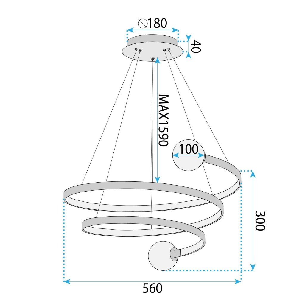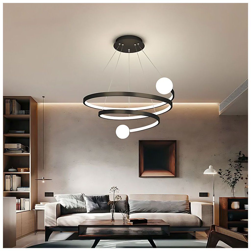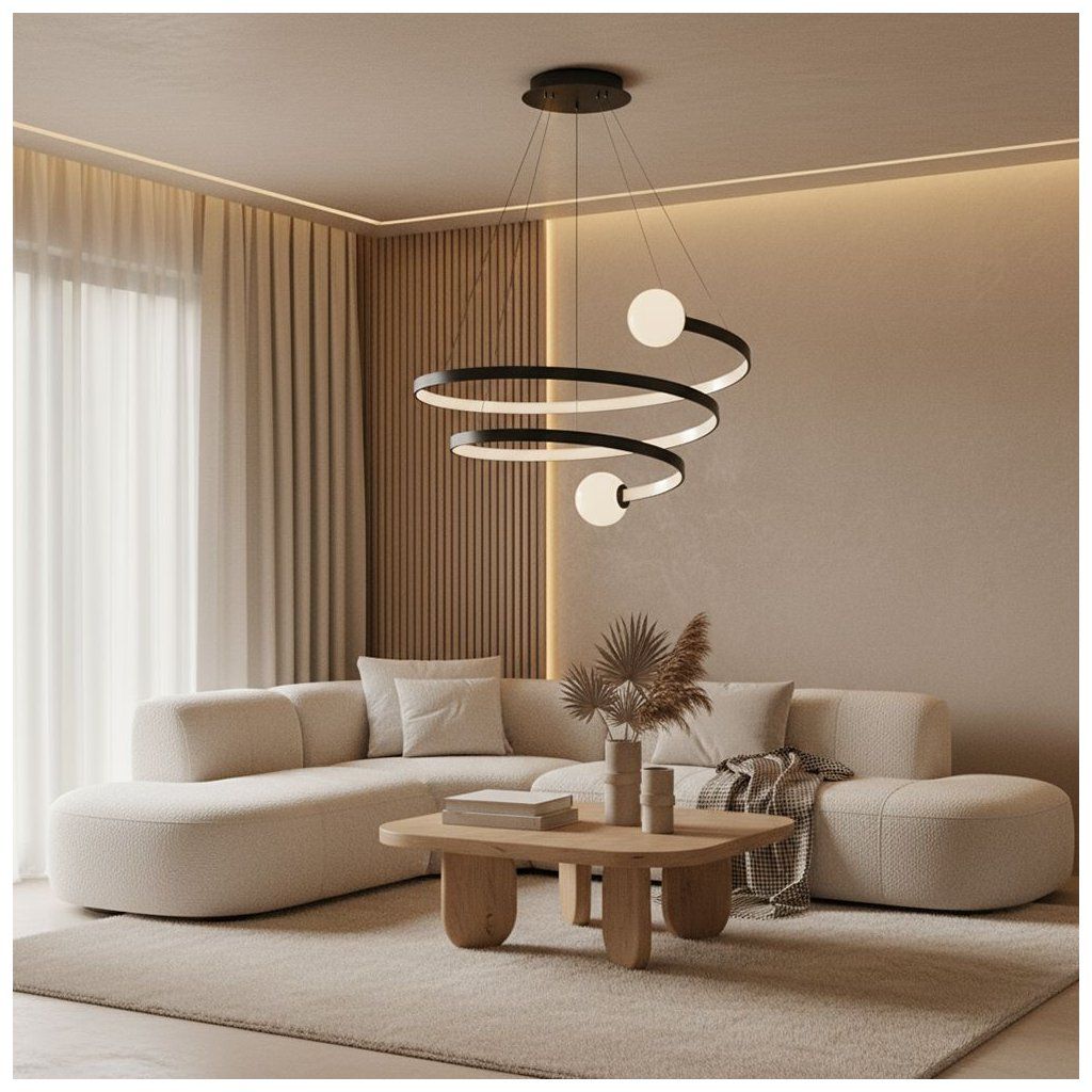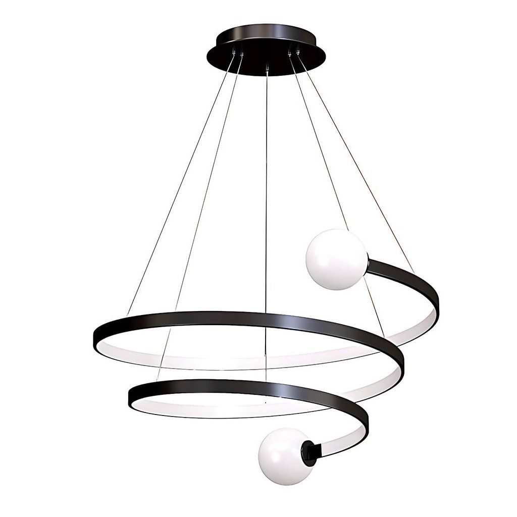 Moderní závěsné svítidlo se spirálovitým tvarem upoutá pozornost už na první pohled. Kombinace jemně zakřivených kroužků a kulovitých stínidel vytváří harmonickou a dynamickou kompozici inspirovanou stylem modern art. Matný černý povrch krásně kontrastuje s mléčnými koulemi, zatímco integrované LED osvětlení jemně rozptyluje světlo a vytváří útulnou atmosféru. Lampa se skvěle hodí jako dominantní prvek v obývacím pokoji, prostorné jídelně nebo moderním hale, kde zvýrazní výšku a charakter prostoru. Nastavitelná výška zavěšení umožňuje snadné přizpůsobení výšce stropu, takže zapadne do velkých i menších prostor. Skvělá volba pro ty, kdo hledají designové osvětlení, které spojuje dekorativní formu s příjemným, ale funkčním světlem.Doplňkové parametry