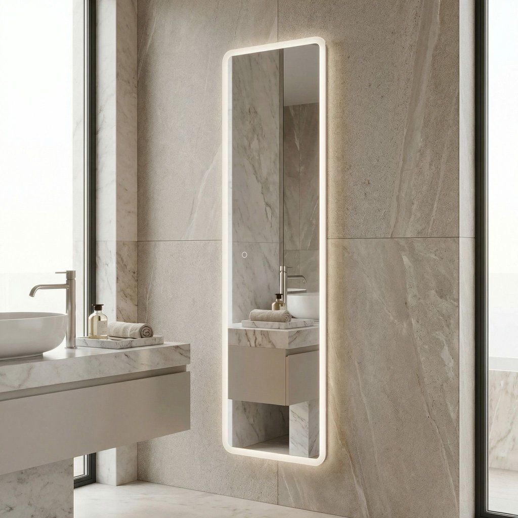 Zaoblené rohy obdélníkové plochy změkčují přísnou vertikální geometrii vysokého zrcadla a dělají jej přístupnějším a modernějším. Mléčný LED rámeček šířky 3 cm po celém obvodu rámcuje plochu rovnoměrným světelným pásem, který funguje jako dekorativní prvek i při vypnutém osvětlení.