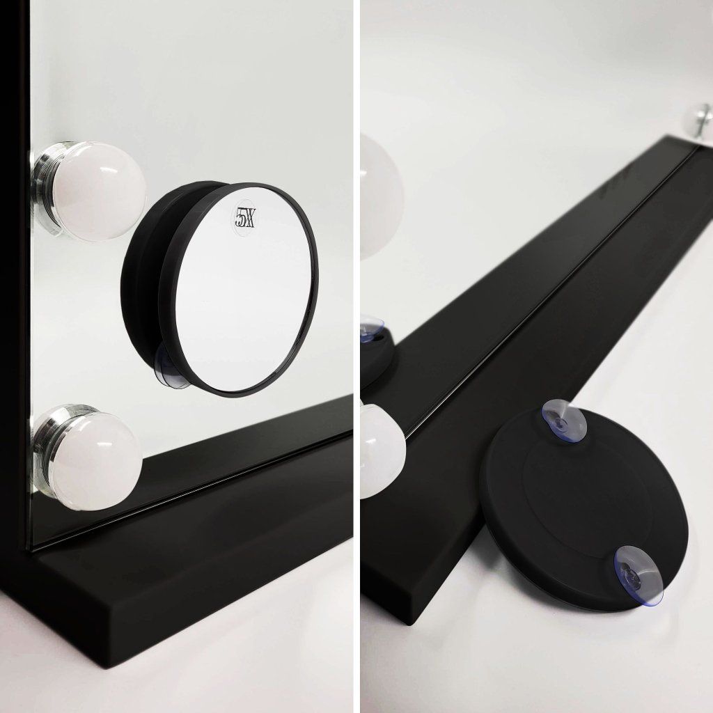 LED žárovky rozmístěné po obvodu černého rámu nabízí regulaci barevné teploty pro přesnou simulaci různých světelných podmínek. Teplá bílá je ideální pro večerní make-up – světlo odpovídá běžnému interiérovému osvětlení restaurací a společenských prostor. Neutrální bílá věrné zobrazuje skutečné odstíny pleti a kosmetiky. Studená bílá zvýrazní kontrasty a je vhodná pro korekční techniky a práci s tmavými odstíny.