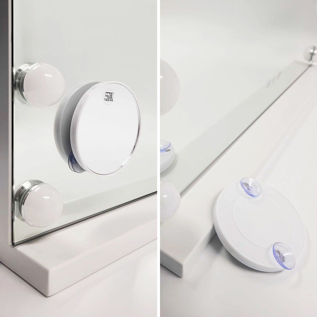 Zrcadlo Hollywood je navrženo pro maximální flexibilitu umístění. Přiložená nožička umožňuje stabilní postavení na nočním stolku, komodě nebo poličce – bez jakékoli montáže, ihned po vybalení. Alternativně lze zrcadlo zavěsit přímo na zeď a vytvořit tak pevný, dekorativní bod celé stěny koupelny, ložnice nebo šatníku.
