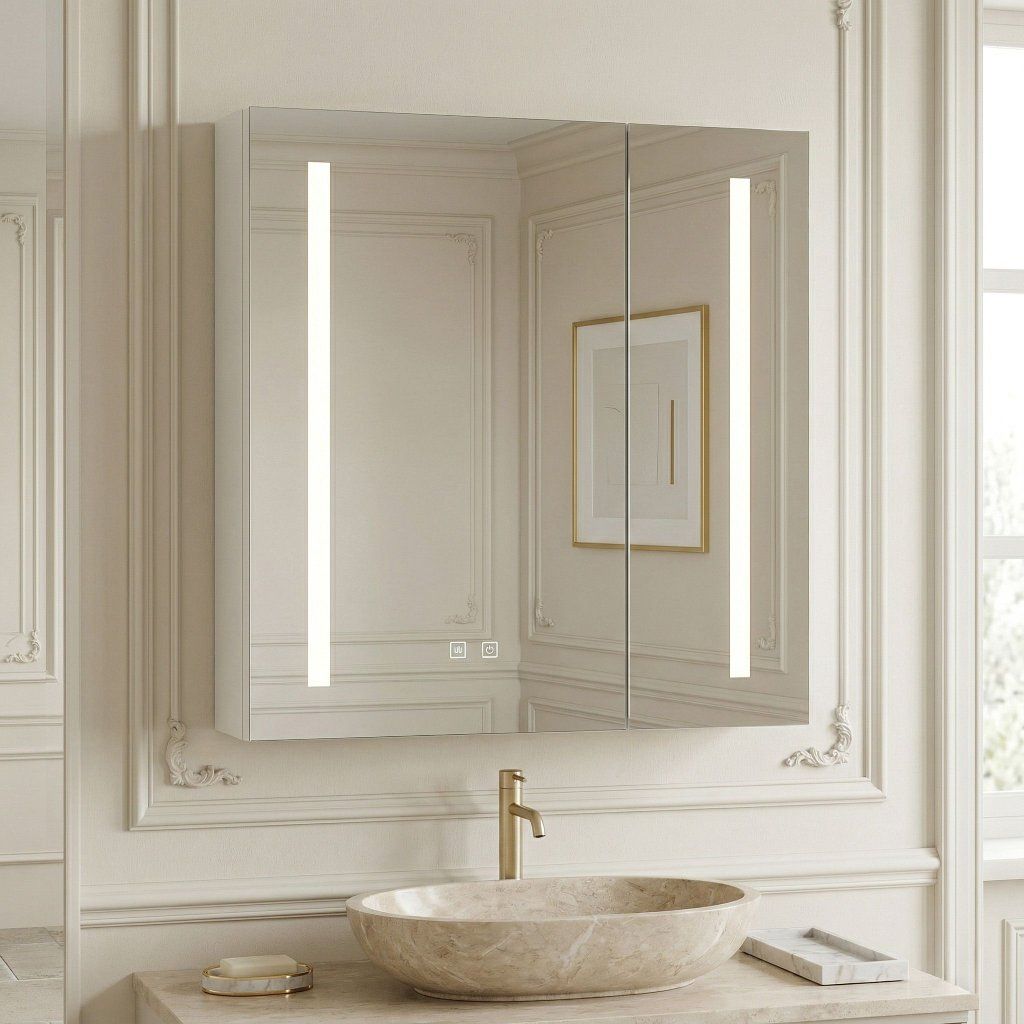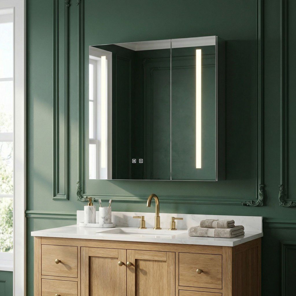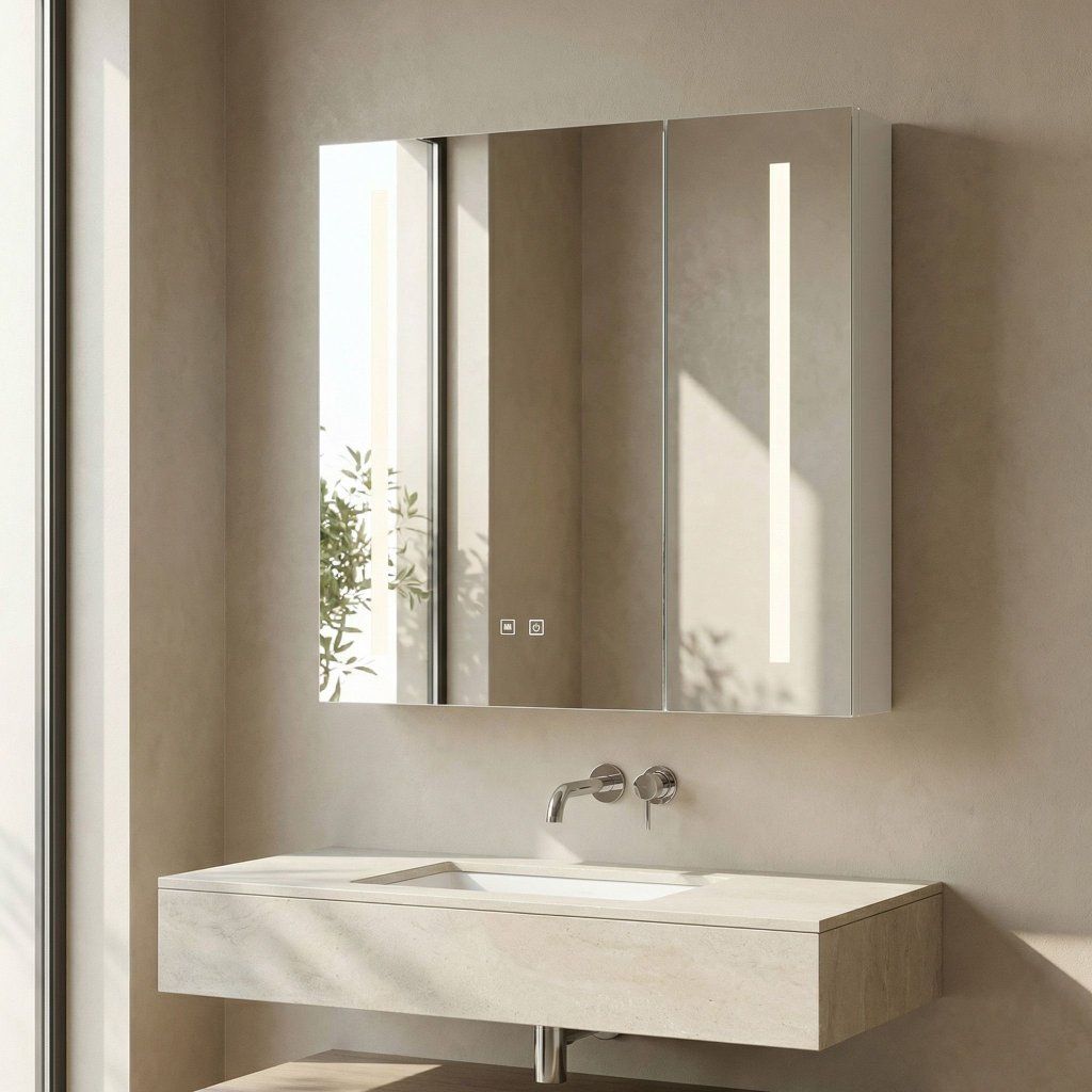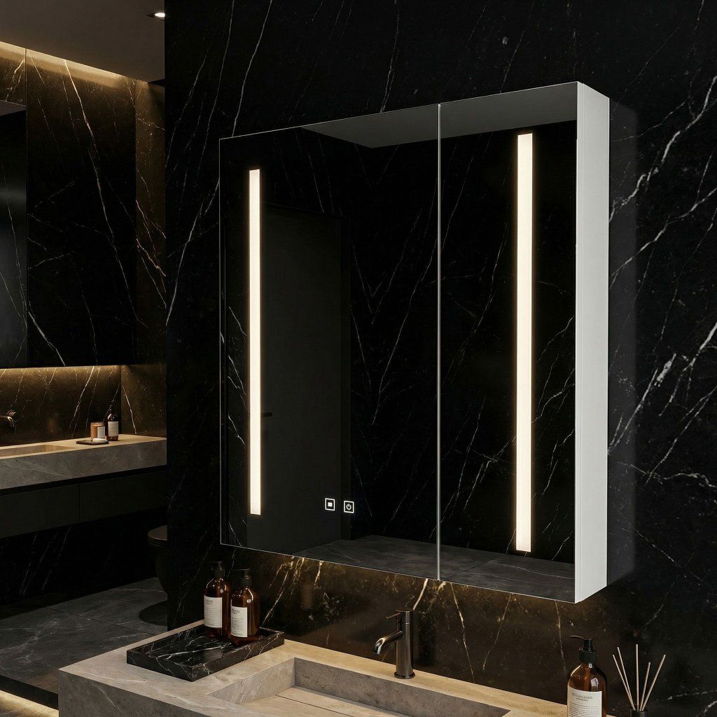 Integrované osvětlení tvoří dvojice svislých LED pásků umístěných přímo na zrcadlové ploše po jejích stranách. Toto rozmístění není náhodné – boční osvětlení eliminuje stíny pod nosem, bradou a kolem očí, které způsobuje horní světlo. Výsledkem je rovnoměrné, měkké osvětlení obličeje, které je nezbytné pro přesné líčení i holení.