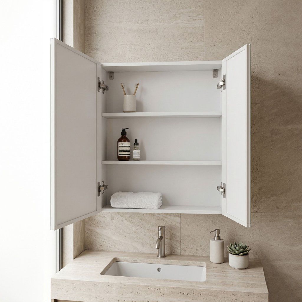 Vnitřek skříňky je rozdělen dvěma poličkami na tři ukládací úrovně, které poskytují dostatek prostoru pro kompletní vybavení každodenní péče. Výška police je přizpůsobena běžným formátům kosmetiky – od plochých krabic po vyšší láhve parfémů a sprejů.