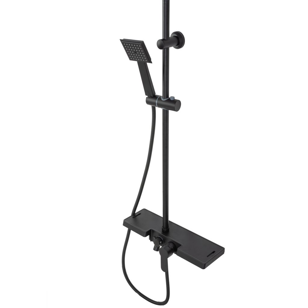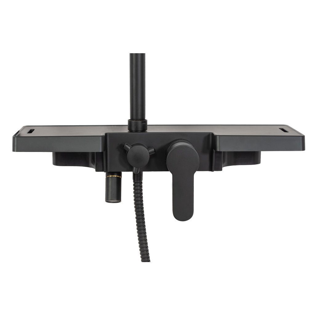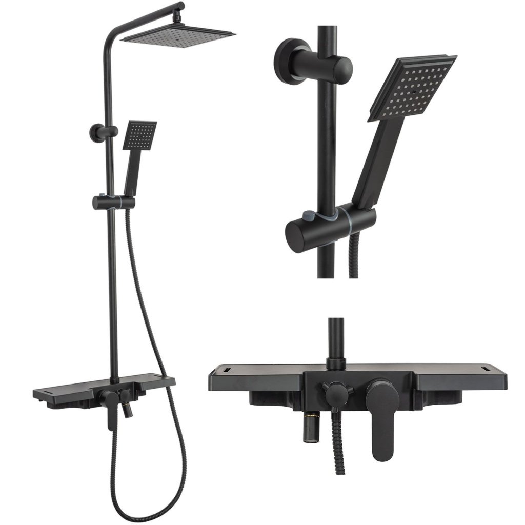 - Souprava obsahuje : poličku s vestavěnou baterií a výtokem, sprchovou hadici se sluchátkem, ocelovou dešťovou sprchovou hlavici