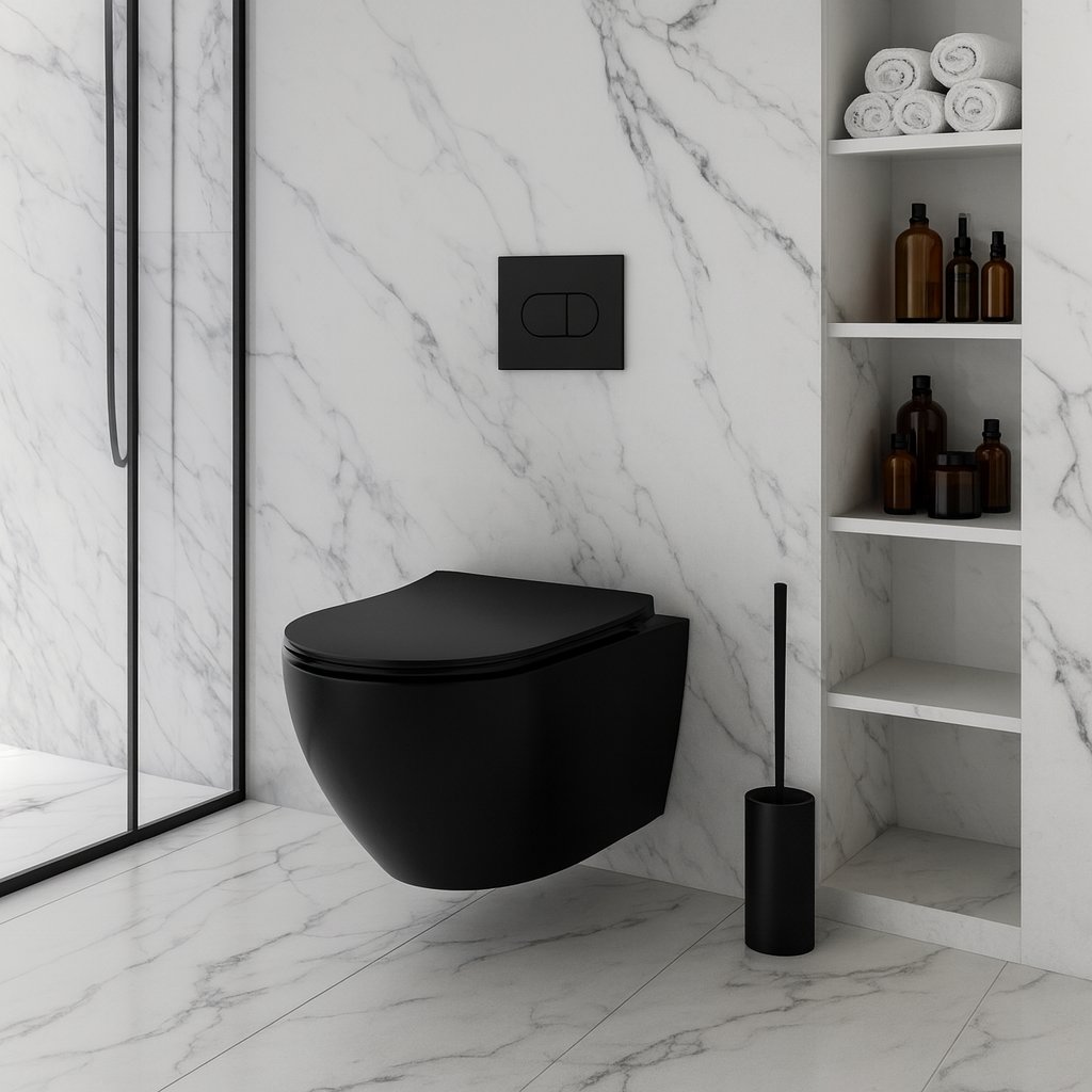 Rea Carlo Mini Tornado NF, závěsná WC mísa 490x365x350mm + toaletní sedátko, černá matná, REA-C3000