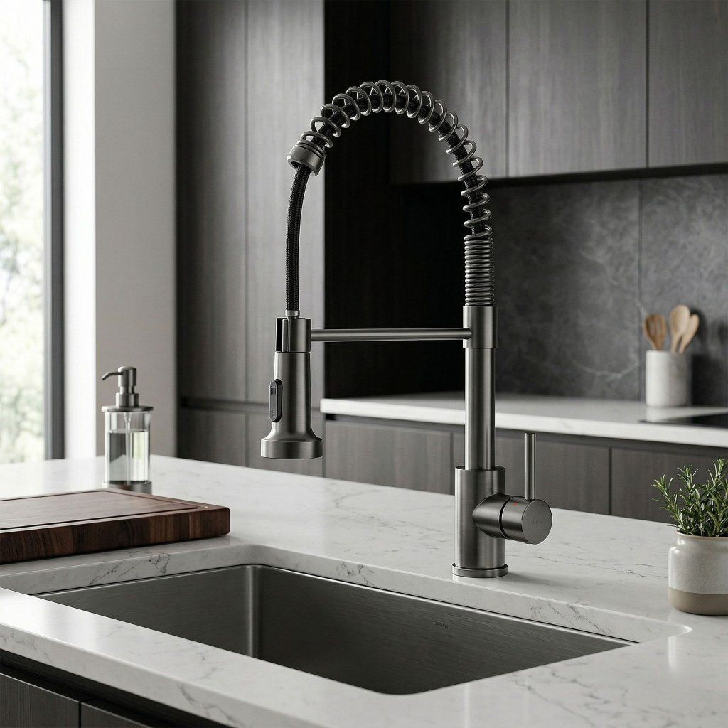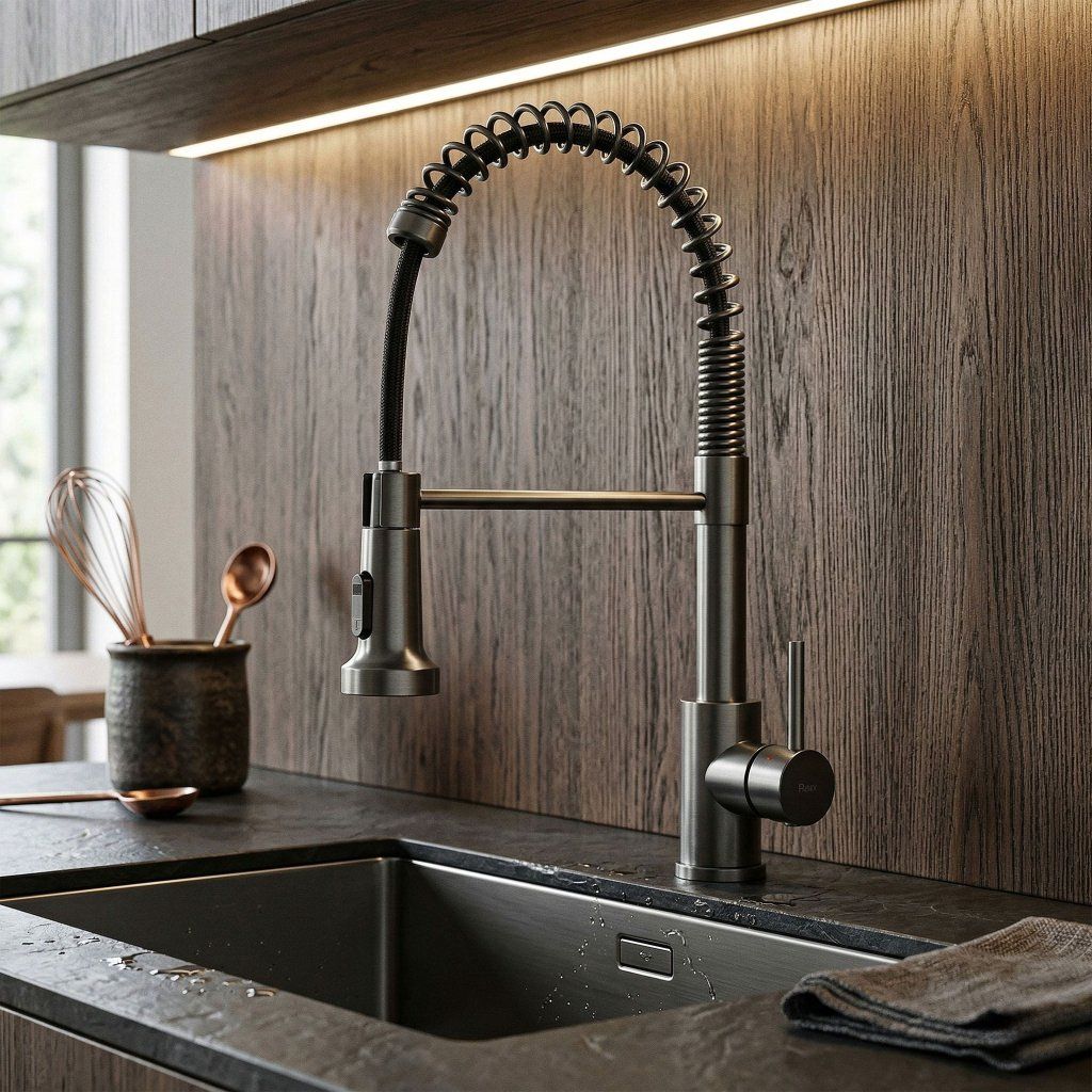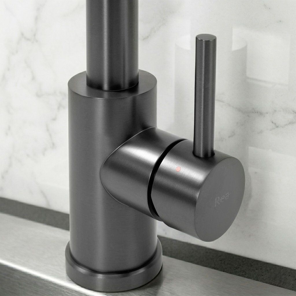 Kuchyňská baterie Rea Colin v provedení Titan (titanová/grafitová) je výrazným designovým prohlášením pro loftové, industriální a minimalistické kuchyně. Jemně broušená titanová povrchová úprava v kombinaci s čistou, štíhlou formou ladí s betonem, tmavými pracovními deskami i dřevovolaminátem – a výrazně odlišuje kuchyni od běžného chromového standardu.