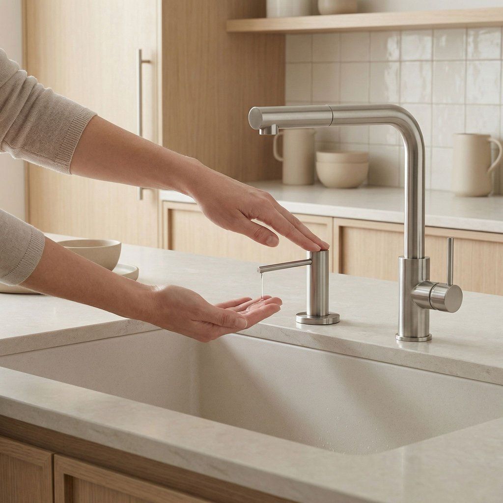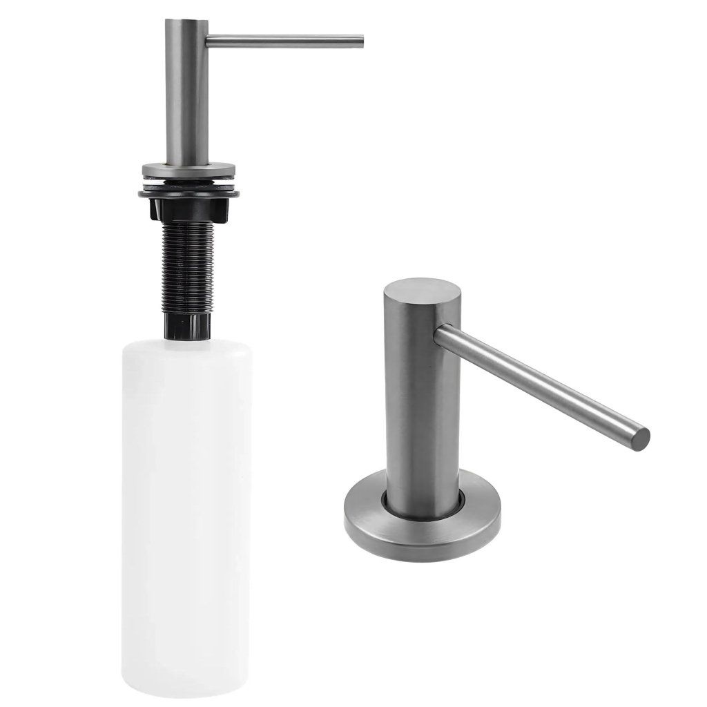 Dávkovač se osazuje přímo do otvoru ve dřezu nebo pracovní desce. Láhev saponátu zmizí z pohledu a celá mycí zóna působí čistě, moderně a reprezentativně – bez kompromisů.