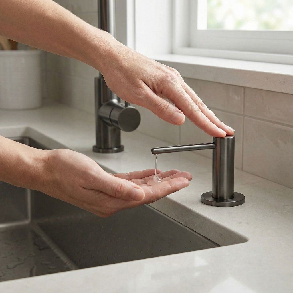 Dávkovač se osazuje přímo do otvoru ve dřezu nebo pracovní desce (zabudovaná montáž). Odpadá nepořádek ze saponátů a lahví na kuchyňské lince a celá zóna mytí působí čistě a reprezentativně.