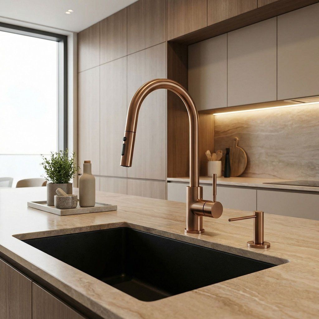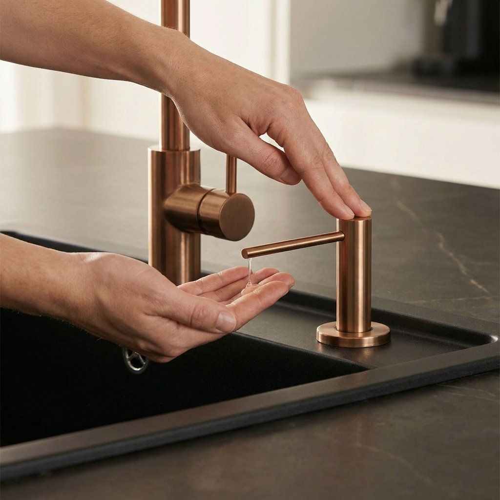 Měděné matné provedení je ideální volbou pro interiéry, kde dominují teplé odstíny zlata, mědi nebo champagne. Pečlivě zvolená povrchová úprava umožňuje snadno sladit dávkovač s dřezem, baterií i ostatními doplňky – výsledkem je soudržný a elegantní celek.