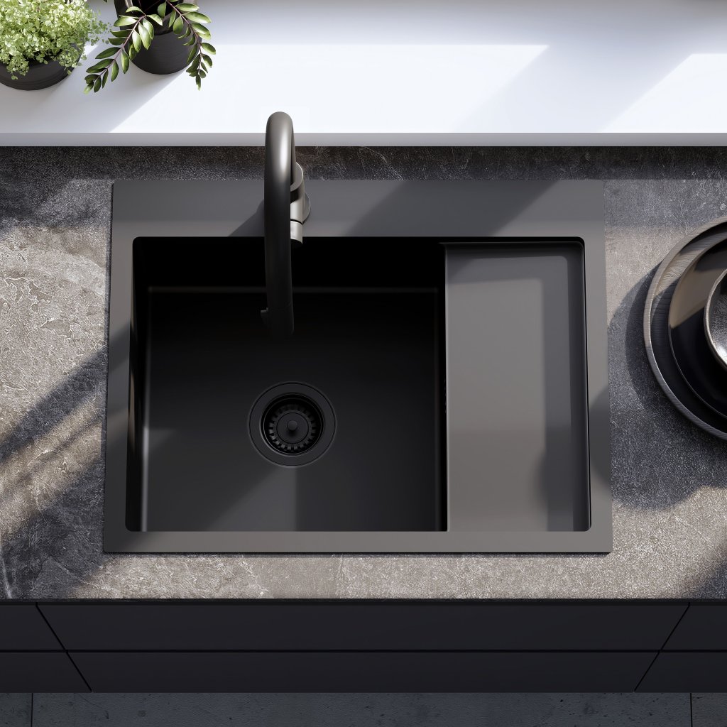 Rea Fin, 1-komorový ocelový dřez 620x480x185 mm, černá matná, ZLE-06014