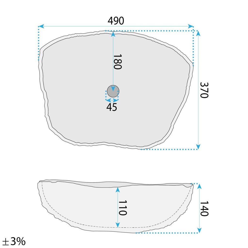 Nepravidelný, organický půdorys 490 × 370 mm záměrně porušuje geometrickou symetrii – žádné rovné hrany, žádné předvídatelné proporce. Tvar umyvadla evokuje přírodní úlomek kamene nebo mořský oblák, což je v dokonalém souladu s mramorovým vzorem povrchu.