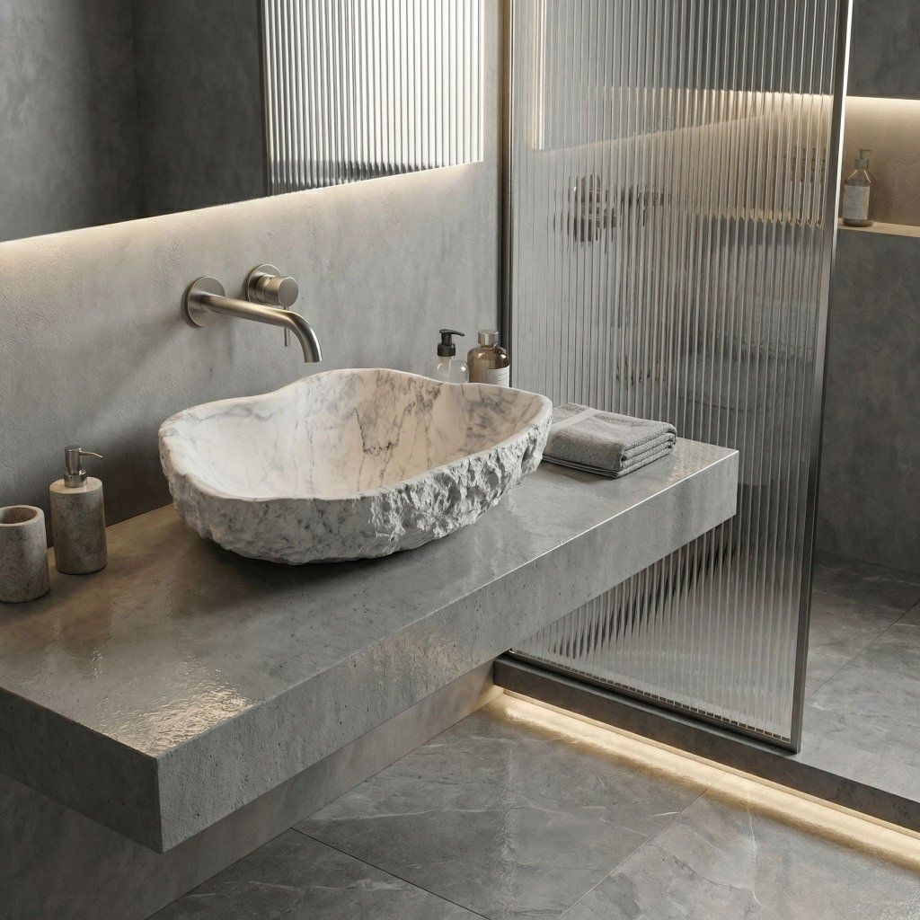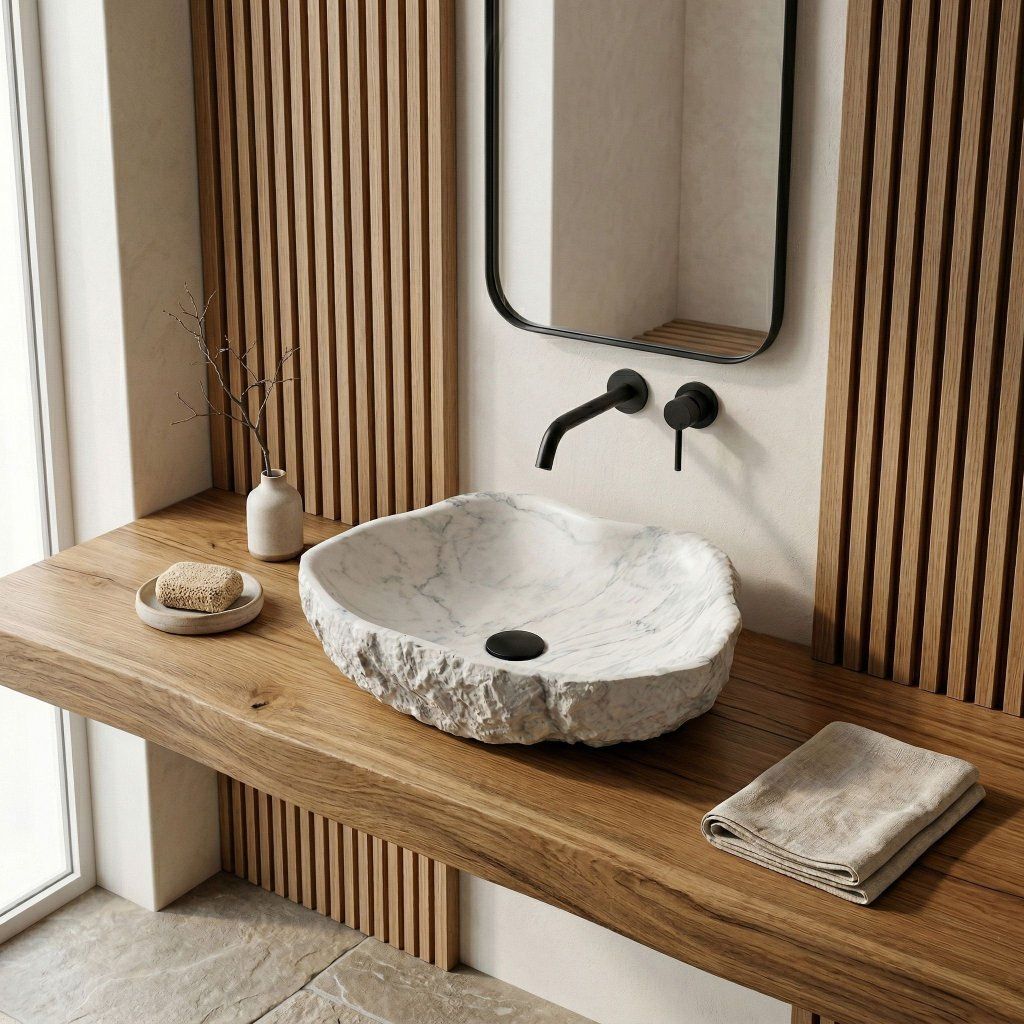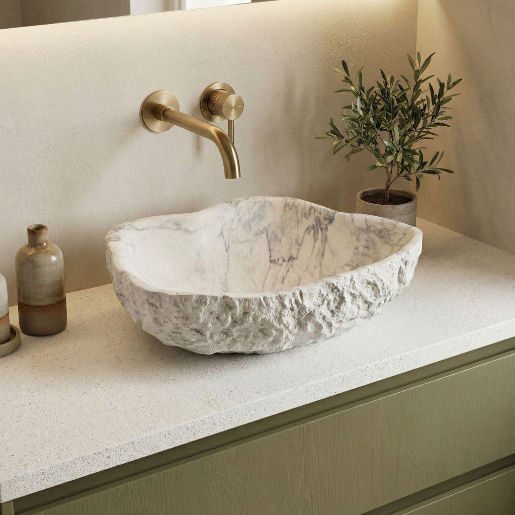 V koupelně inspirované přírodou – s dřevěnými prvky, přírodním kamenem a rostlinami – hrubá textura exteriéru působí jako přímý odkaz na svět mimo městskou civilizaci. Isla Marlo je umyvadlo, které vypráví příběh, aniž by muselo křičet.