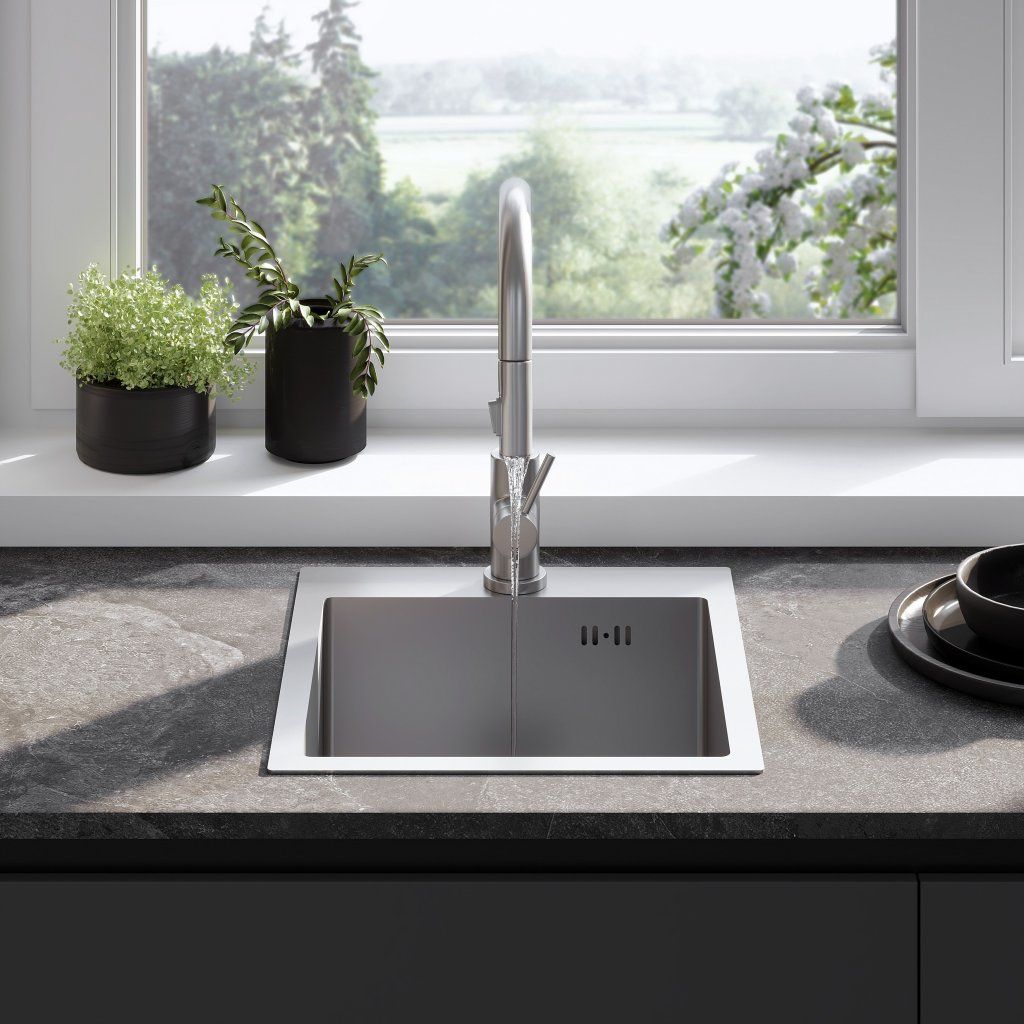 - Odtok v barvě oceli – dokonale ladí s elegantním povrchem dřezu.
