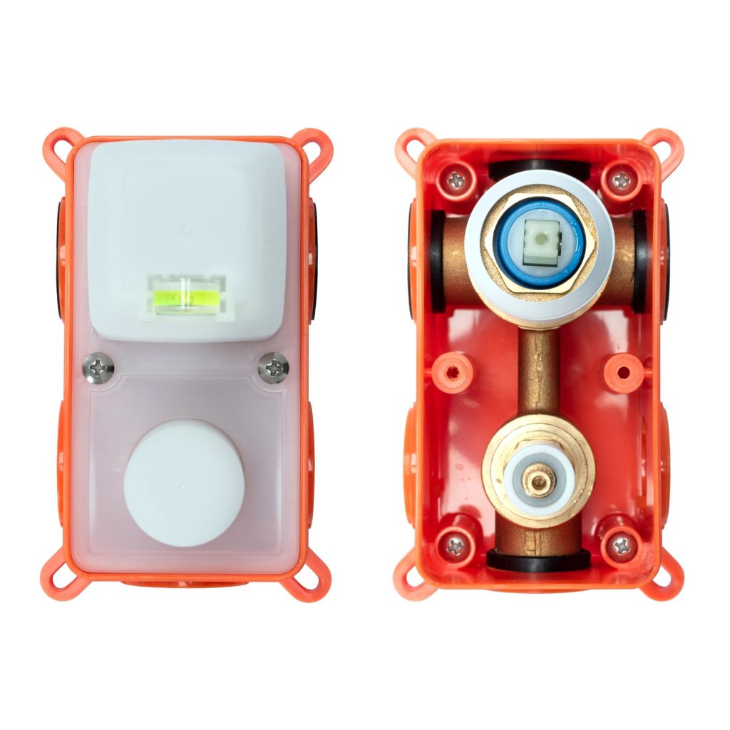 Inovativní systém Box pro instalaci baterií pod omítku. Systém zajišťuje pohodlnou a rychlou instalaci. Je vyroben z plastových a mosazných vnitřních prvků, což zaručuje vysokou kvalitu a spolehlivost. Prvek je vybaven maskovací částí, která chrání vnitřní prvky během montáže a vodováhou usnadňující správnou a přesnou montáž. Systém umožňuje snadný přístup k vnitřním komponentům baterie po instalaci kvůli údržbě.