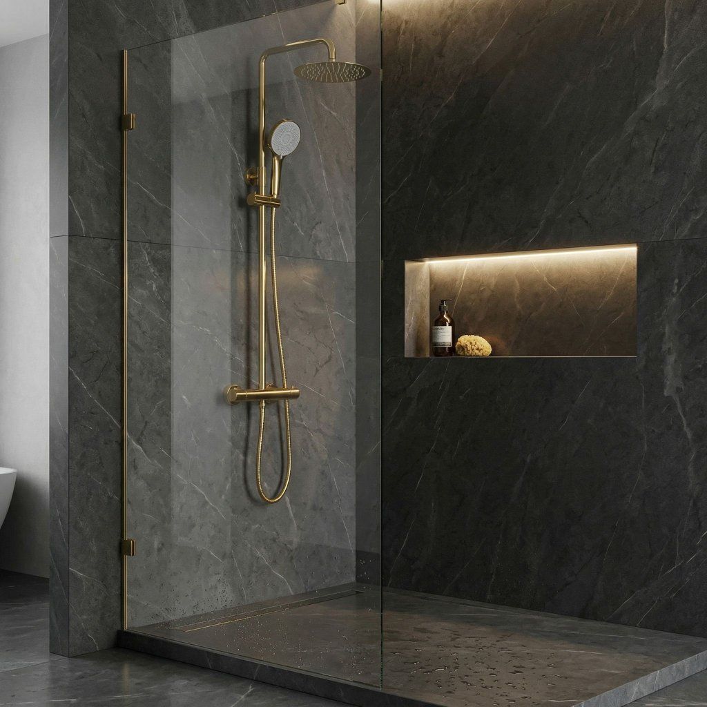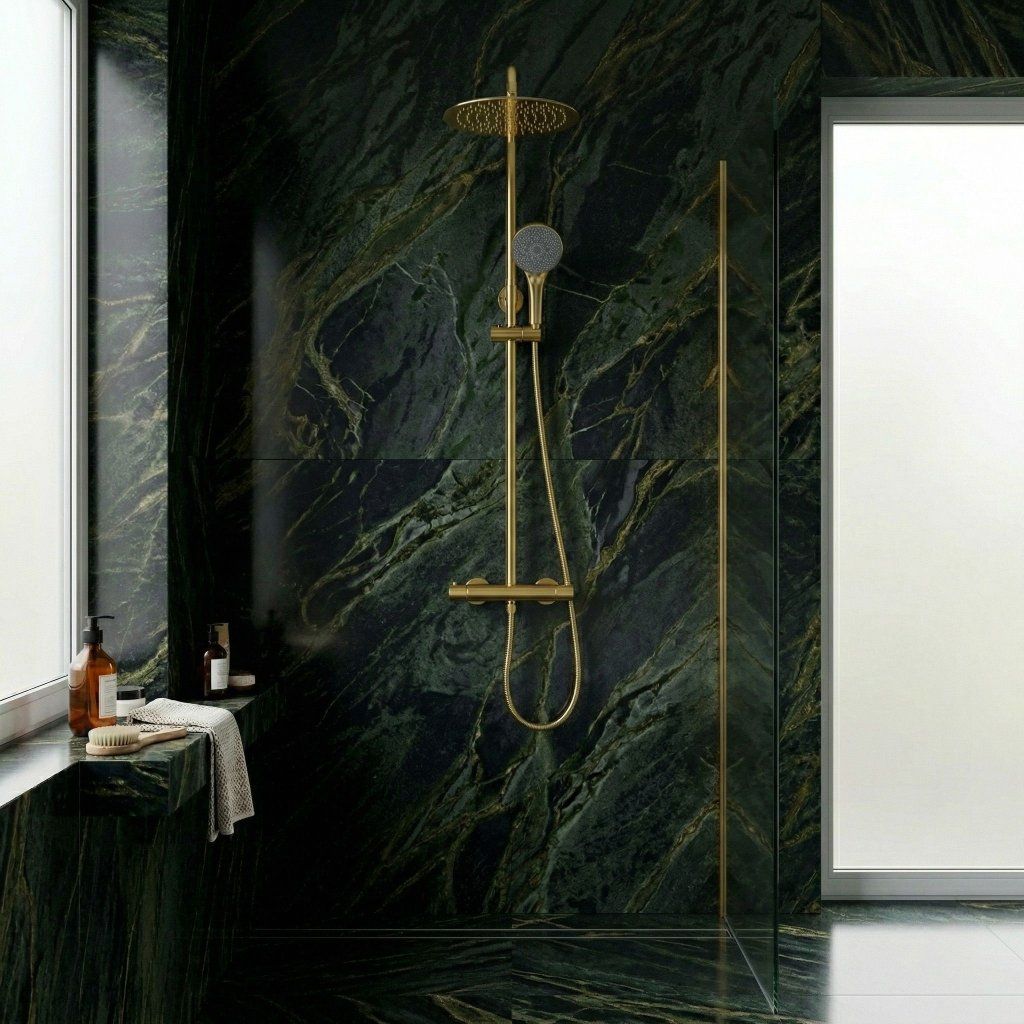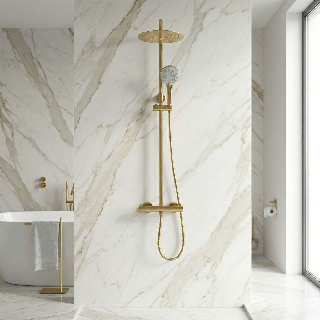 Součástí setu je velká ultra-tenká dešťová hlavice pro luxusní, rovnoměrný proud vody a dopasovaná ruční sprchová hlavice. Oba prvky jsou ve zlatém provedení a tvoří harmonickou, esteticky dokonalou sestavu sprchového koutu. Výška systému je plně nastavitelná v rozsahu 845–1205 mm.