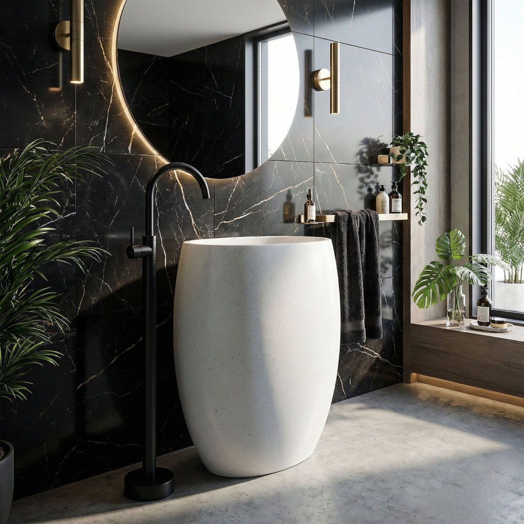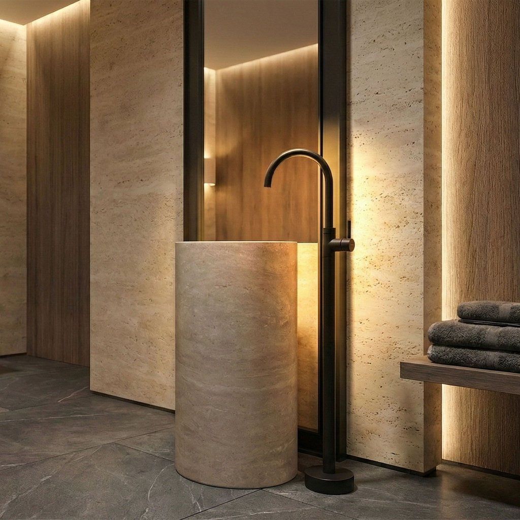 Podlahová instalace je ideálním řešením pro designové koupelny s umyvadlem na desku nebo volně stojícím umyvadlem. Baterie se stává výrazným estetickým prvkem interiéru.